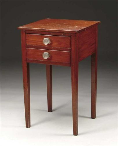 HEPPLEWHITE RED WASH TWO DRAWER STAND. Original overhanging top, drawers fitted with sandwich press glass pulls, Maine, early 19th Century. SIZE: 28-3/4” h x top 17-1/4” sq. CONDITION: Generally very good, some top finish imperfections. 9-26826