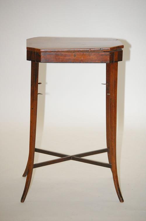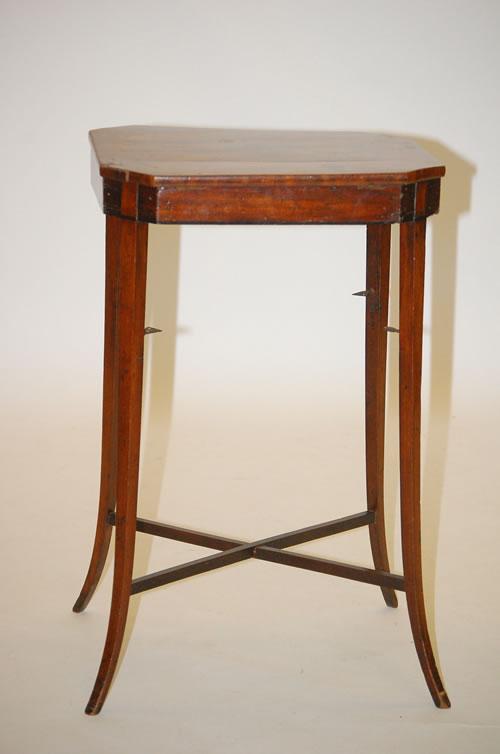 HEPPLEWHITE SEWING STAND - MAHOGANY STAND W/ OCTAGONAL FRAME & LID ON DELICATE SQUARE TAPERED LEGS W/ SABRED TIPS & CROSS STRETCHER BELOW (31" T X 20 1/2" W X 17" D) - WEAR, REPAIRS, LOSSES, IMPERFECTIONS