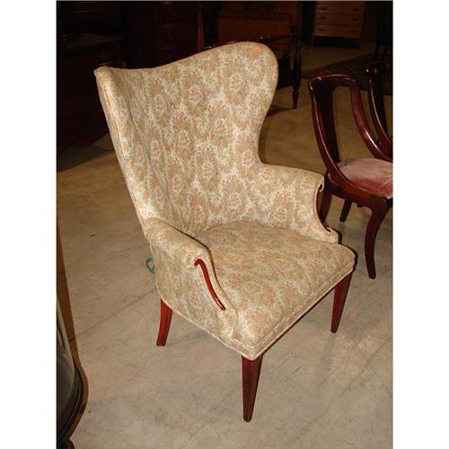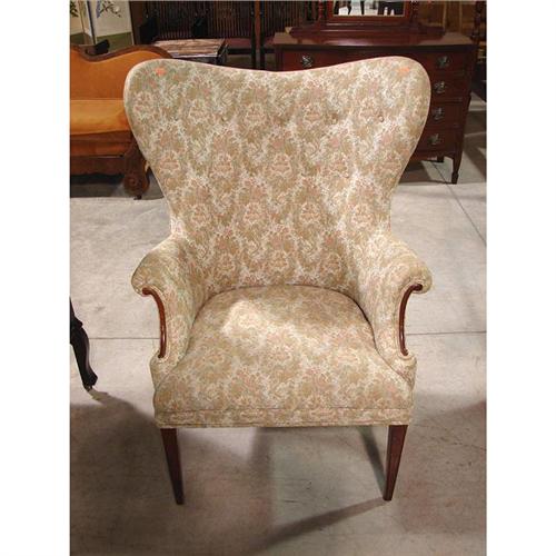 HEPPLEWHITE STYLE FIRESIDE CHAIR. Has green colored floral brocade upholstery. 44” H to top of back.