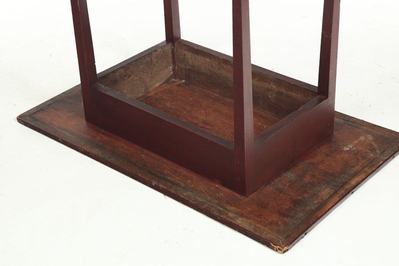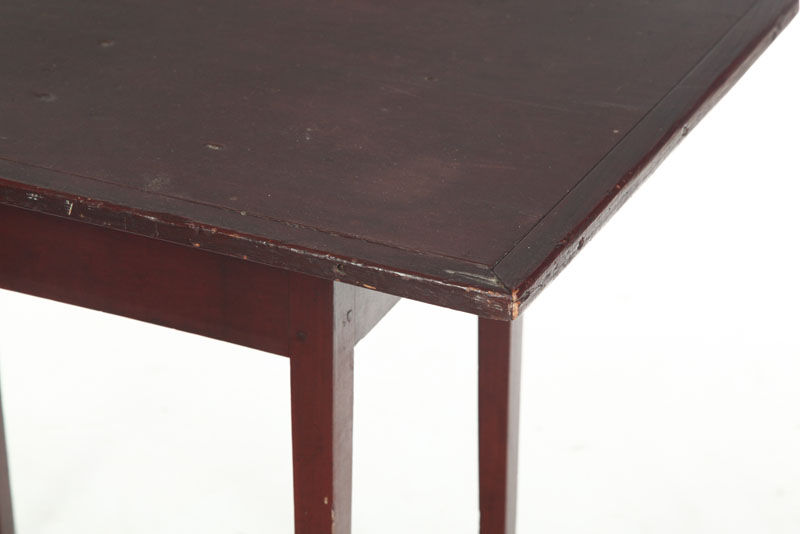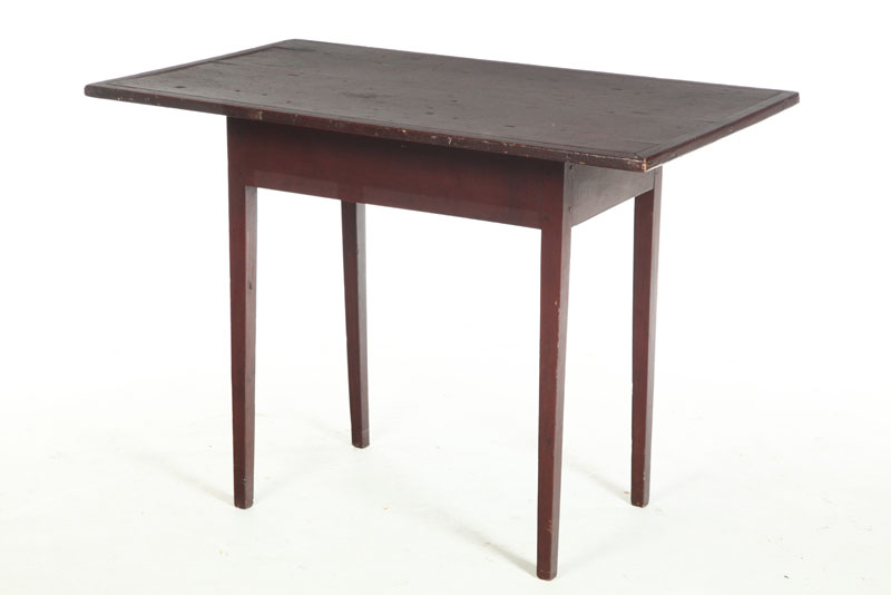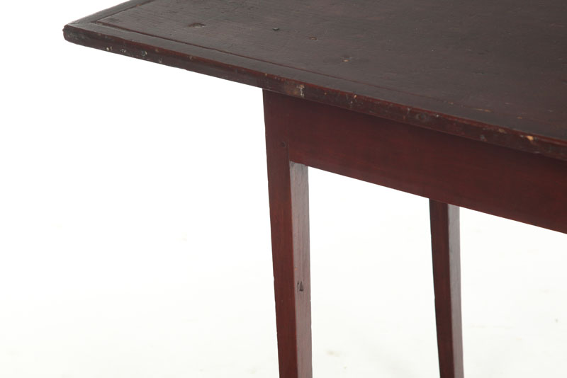 American,19th century, hardwood and pine. Delicate square tapered legs, mortised and pinned apron, and one-board top with breadboard edges. Old red finish. Imperfections. 27"h. 37"w. 22 3/4"d.