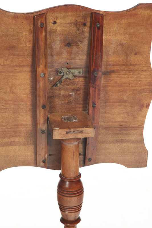 New England, early 19th century, birch. Tripod base with spider legs, turned column and shaped one-board top. Top latch replaced. Refinished. 28"h. top is 16 3/4" x 17