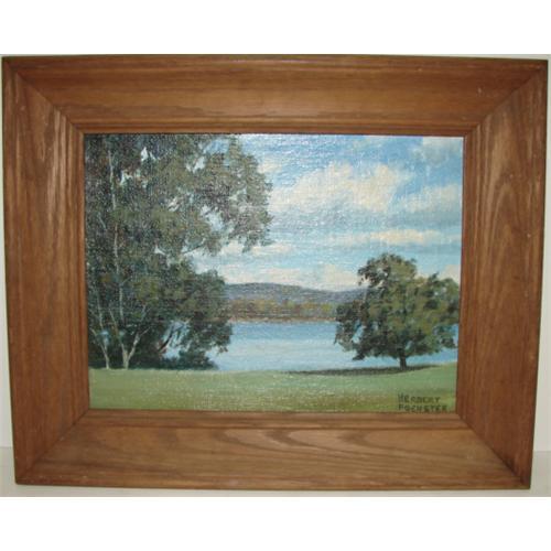 HERBERT FOERSTER (20TH CENTURY) OIL PAINTING. Oil on board. Depicts a pair of trees at the edge of a pond. Signed in lower right. Not examined out of frame. 9” x 12”