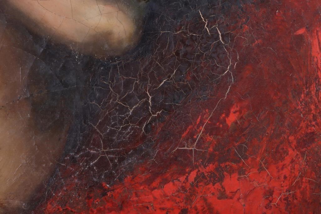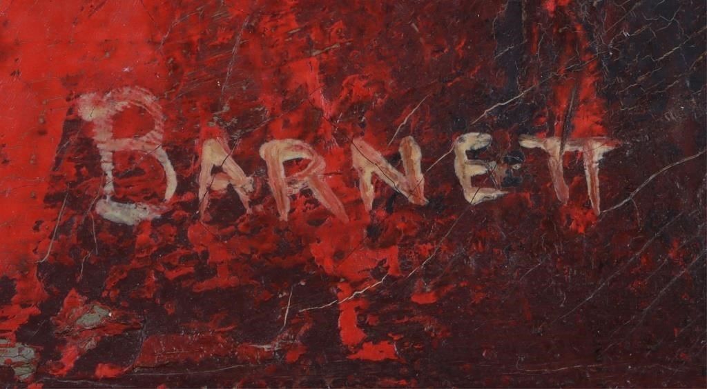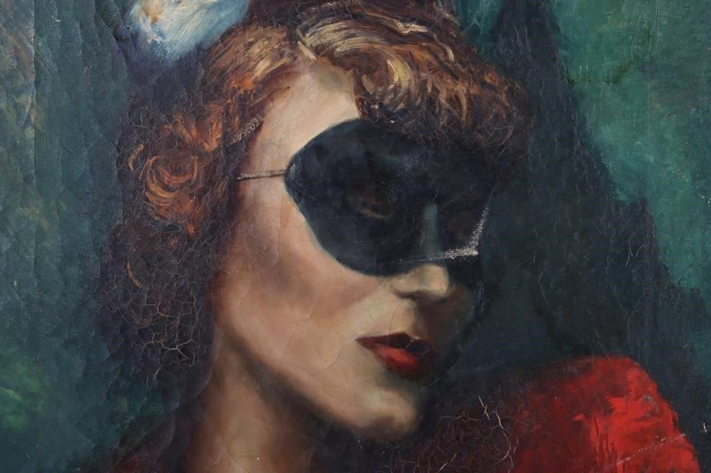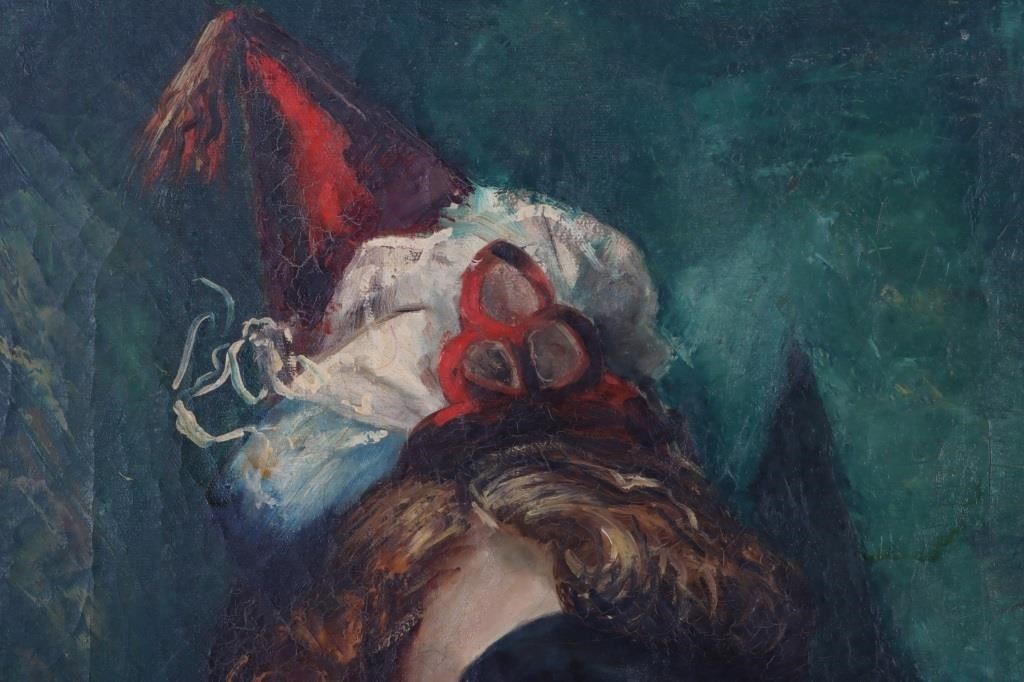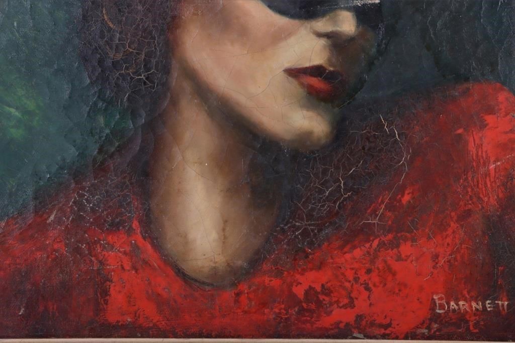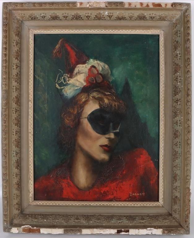Herbert Phillip Barnett (American, 1910-1972) framed original oil painting of a masked figure wearing birthday hat. We are attributing this piece to Herbert based on 3 criteria: the signature, some components of the style, and the condition of the piece (the craquelure specifically) places it in a date range that makes it possibly his. We do not guaranty this is his painting but based on our limited resources, find it plausible.