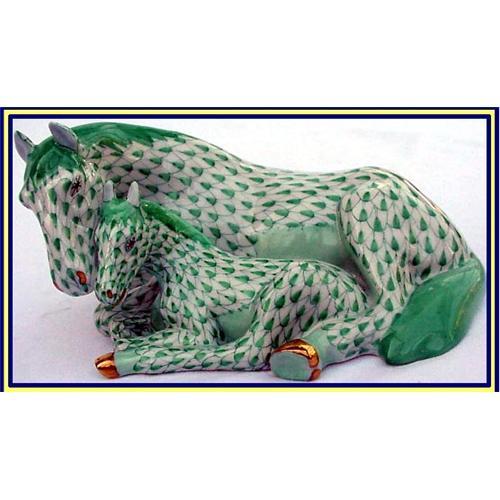 <table width="100%" border="0" cellspacing="0" cellpadding="4"><tr><td><em> </em></td></tr><tr> <td width="100%"> Porcelain horse / mare and foal in handpainted green fishnet pattern made by Herend, Hungary. Gold trim to nostrils and hooves.<BR>Measures 5 1/2 inches long and a little under 3inches high..<BR>Blue Herend mark and A5560/SVHV and D97. Handpainted FIRST EDITION.<BR>MINT condition. </td></tr><tr> <td> </td></tr><tr> <td>Reference #: 1415a</td></tr><tr><td>Condition:See Description</td></tr><tr><td>Year:See Description</td></tr><tr><td>Title:HEREND HUNGARY GREEN FISHNET MARE FOAL 1ST ED</td></tr><tr><td>Location:Boca Raton</td></tr></table>