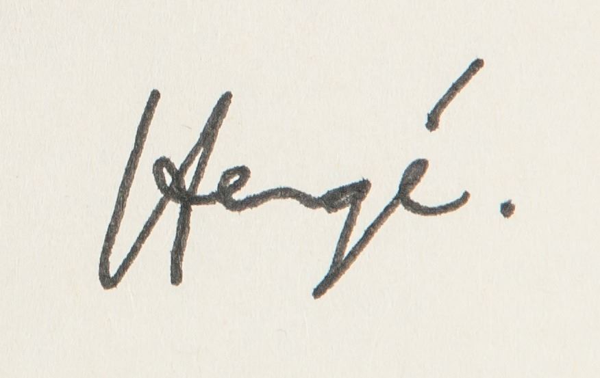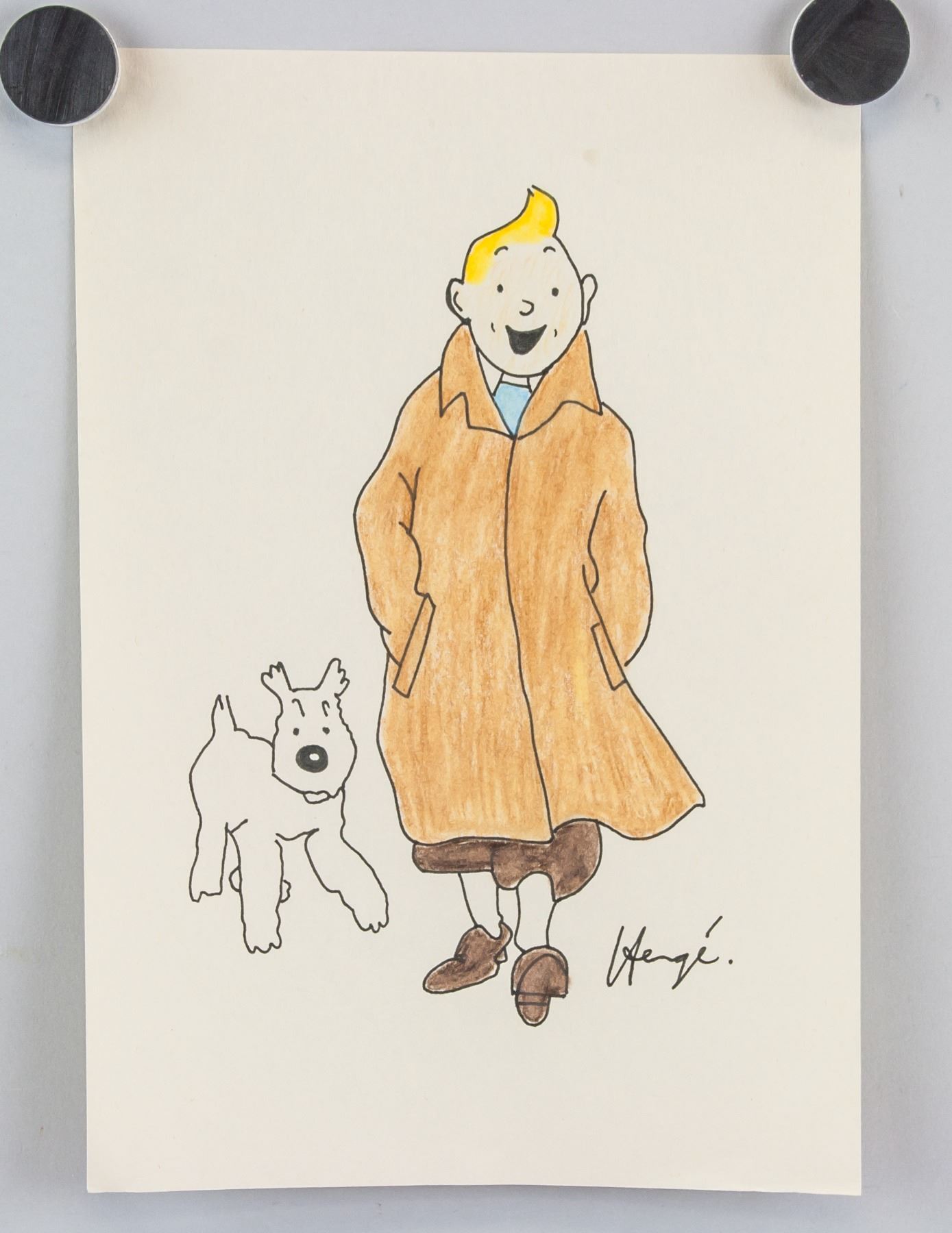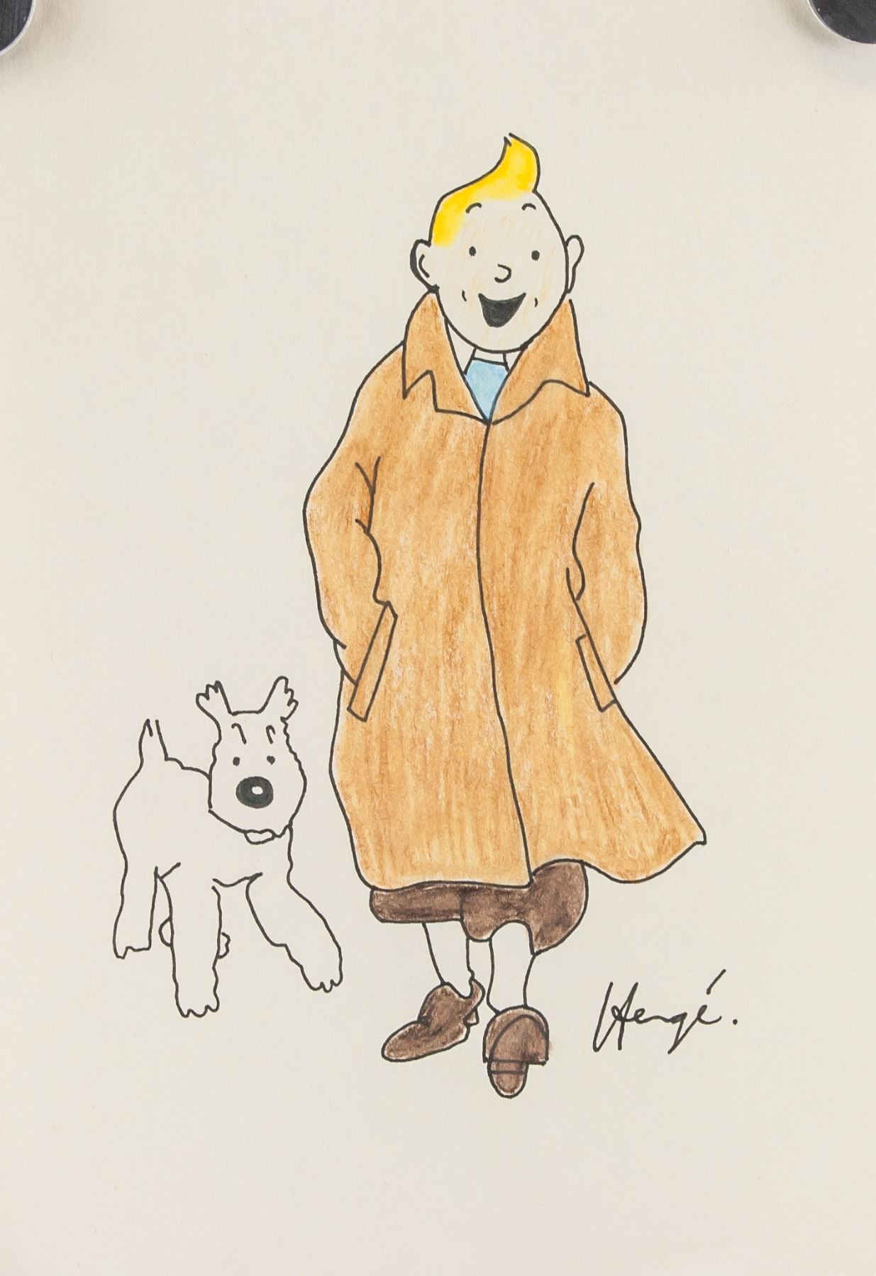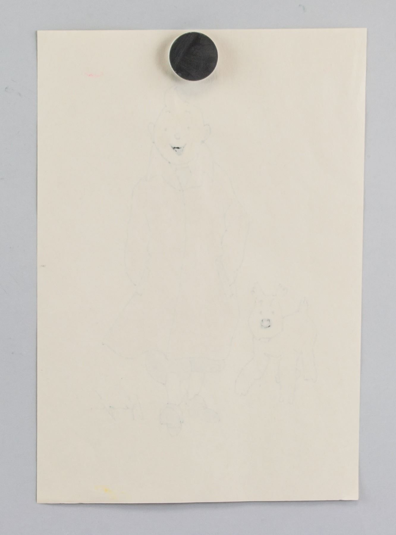 Mixed media on paper. Featuring Tintin and Snowy. Signed and attr. Herge (Belgian, 1907-1983). 9.6 x 6.7 in. (24.5 x 17 cm). Georges Propser Remi known by the pen name Herge was a Belgian cartoonist. He is best known for creating The Adventures of Tintin, the series of comic albums which are considered one of the most popular European comics of the 20th century. He was also responsible for two other well-known series, Quick & Flupke (1930-40) and The Adventures of Jo, Zette and Jocko (1936-57). His works were executed in his distinct ligne claire drawing style. PROVENANCE: Private Collection (South America)