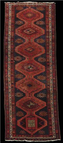 HERIZ ORIENTAL RUNNER. Last half of the 20th Century. Seven connected medallions in red on a field of black. Multiple borders. SIZE: 12’10” x 3’11”. CONDITION: Very good. 9-26990