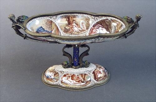 HERMAN BOEHM - An antique Viennese enamel and silver centerpiece. The scalloped oval base and bowl are intricately hand painted with mythological scenes. Handles in the form of winged female figures. Two stylized dolphins surround the blue enamel painted support. 5" high, 8 1/4" long. Marked underside. Circa 1880.