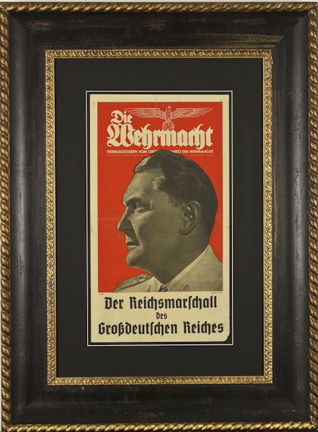 Fine German World War II advertisement for the Nazi publication Die Werhmacht with Hermann Göring, "Die Reichsmarshall des Grossdeutschen Reiches" in side profile. Measures 12" x 20" and dated No. 16, July 31, 1940. Die Wehrmacht, an inexpensive propagandistic German military magazine, was published from 1936-1944. Folds, pinholes at corners from hanging, light wear. Very good condition, expertly floated on a black mat and presented in a wood and gilt frame. Not examined out of frame.Requires third-party shipping. Please see Terms and Conditions of Sale.