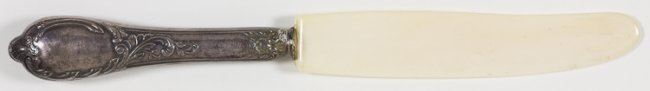 Very rare silver fruit knife with ivory-colored blade from a set once owned by Reichsmarshal Hermann Goring, 8 1/4" long overall, a fanciful baroque-style handle lightly engraved with the German national eagle clutching two marshal's batons. No hallmarks, as is oft the case with knives. Tarnished, else very good.