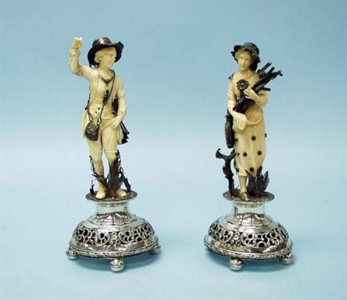 HERMANN BOEHM, AUSTRIA. An important pair of antique Viennese carved ivory figures on silver pedestal base. One handcarved in the form of a young woman gathering wood, the other figure of a young man dressed as a hunter carrying a silver bagpipe. Each mounted on pierce work decorated silver base. 9" and 9 1/4" high respectively. Hallmarked. Very fine quality. Cca. 1890. 20000-25000