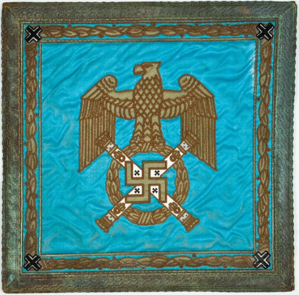 Hermann Goering's Reichsmarshall's automobile command flag, 11 1/2" x 11 1/2", a fine piece bearing on one side an embroidered Reichsmarshall's eagle over crossed batons with a wreath of laurel leaves, set on a light blue background as is usually the case with many of Goering's personal flags and decorations. The reverse features an embroidered wreathed 1939 Iron Cross trimmed in silver bullion, with four Luftwaffe eagles over crossed batons at each corner of the flag. Gold piping surrounds each side of the design, with a broader border of bullion piping present which is heavily oxidized and discolored. This type of automobile flag would have been secured to the vehicle in a celluloid case with three or four grommets - it is not present. A rare and desirable relic.