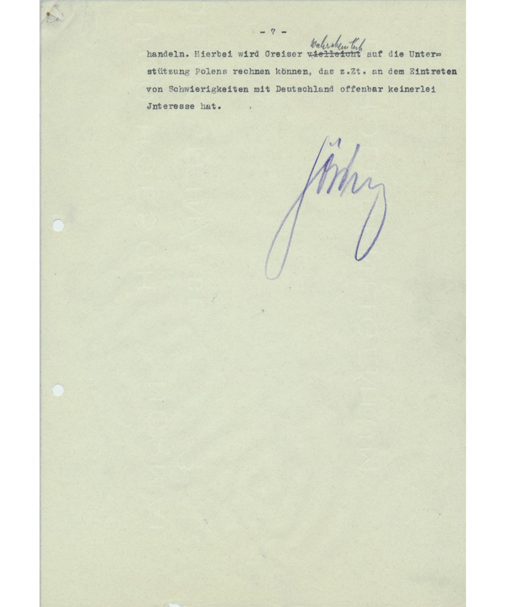 (1893 - 1946) German politician who began his career as an ace in World War I, rose to become Hitler's right-hand man and head of the Luftwaffe, finally captured and committed suicide on the eve of his execution. Important content typed D.S. "Goering", 7pp. 4to., [n.p.], May 20, 1935], the minutes of a meeting concerning the fate of the Free City of Danzig which was attended by Goering, Konstantin von Neurath, Count Schwerin von Krosigk, Wilhem Frick, Hjalmar Schacht, and State Secretary Backe, and from Danzig, Gauleiter Forster and Senate President Arthur Greiser. The group discusses the near bankruptcy of Danzig, in part: "...we will not be able to avoid the introduction of the [Polish] zloty forever, but if Danzig wants to deny the unification of currencies, there will be problems developing with Poland, which will have influence on German politics...we must take measures so that the decline of the [Danzig] gulden is avoided...the propping-up of the currency by financial means is endless, so we must help Danzig in other ways, especially the traffic of goods...Danzig has no assets to pay its employees...that will allow Poland to become involved...the oppostion is strong...in the next public election National Socialism will be in danger...The Reich must support Danzig with additional funds...use propaganda on the citizens...books, magazines, and films...to counteract the coming developments...Germany has no solution to the Danzig question at the moment...the first thing is the reconstitution of Germany's great standing which requires Germany's rearmament...and Germany cannot be held back because of the financial needs of Danzig...". Boldly signed in indelible pencil at conclusion. The minutes are accompanied by a letter from JOHANN LUDWIN VON KROSIGK (1887-1977), Minister of Finance from 1932-45, 1p. 4to. on official letterhead, Berlin, May 25, 1935 forwarding Goering's signed minutes to the Prussian Minister in Berlin and asking him to edit the text. Docketed at top, file holes, else very good. Also present is a T.L.S., 1p. 4to., State Dept. letterhead, Berlin, Sep. 9, 1935, from an unknown party returning Goering's remarks. Overall very good. The economic policy of Danzig's Nazi-led government, including the retrenchment of financial aid from Germany led to a devaluation of more than 40% of the Danziger Gulden in 1935. Reserves and foreign assets declined massively, and Poland protested when Danzig's Senate reduced the value of the Gulden so that it would be the same as the Polish Zloty.