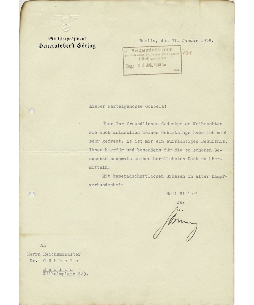 (1893 - 1946) German politician who began his career as an ace in World War I, rose to become Hitler's right-hand man and head of the Luftwaffe, finally captured and committed suicide on the eve of his execution. Good association T.L.S. on his personal Ministerpresident letterhead, 1p. 4to., Berlin, Jan. 21, 1938 to Minister of Propaganda JOSEPH GOEBBELS. Goering thanks his long-time adversary for remembering him with gifts given on the occasion of his birthday and Christmas, concluding: "...with comradely wishes in old solidarity Heil Hitler!...". File holes at left, docketed, and scorched at top during an attempt to burn Goebbels' papers - still fine.