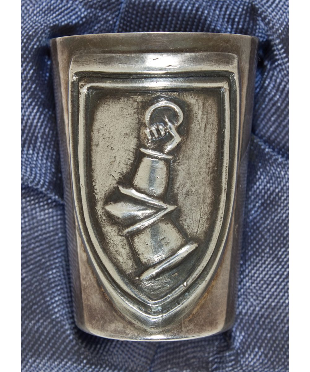A gift given by Reichsmarshall Hermann Goring an typical of his indulgent lifestyle, a 1 3/4" tall silver "shot" class bearing his heraldic shield in high relief, along with the original presentation box. The cup shows Goring's shield on one side, an upraised arm bearing a ring, contained within a shield. The bottom of the cup is hallmarked with the half moon and crown (present on all German silver after 1888) and 835 standard mark, as well as the Wilhelm Binder maker's mark. It is contained within a fitted cardboard box lined in blue satin with faux reptile finish. Cup is fine, box is slightly worn.