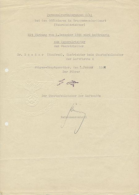 (1893 - 1946) German politician who began his career as an ace in World War I, rose to become Hitler's right-hand man and head of the Luftwaffe, finally captured and committed suicide on the eve of his execution. Rare D.S. "Goering", 1p. large 4to., Berlin, Jan 3, 1945 [marked in error "1944"], an appointment of the highest ranking Generalrichter (judge with the rank of general) for the Luftwaffe, the last Luftwaffe appointment of its type, issued to Dr. Manfred Roeder. Additionally signed with a rubber stamp by Adolf Hitler, who used the stamp only following the bomb attempt on his life, during the period December 1944 to January 1945. Files holes at left margin, else fine. MANFRED ROEDER (1900-1971) led the investigation, examinations and later the prosecution of the German Resistance group, the Red Orchestra. He shared responsibility for the dozens of death sentences handed down by the Reich court martial, but was never convicted of any crime.