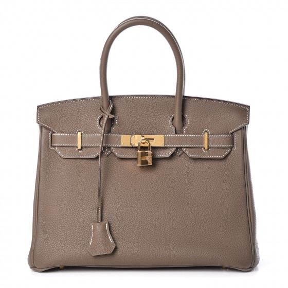 Description: Etoupe handbag is finely crafted of grained calfskin leather in taupe. The bag features rolled leather top handles, and a short front flap that secures with a strap and polished gold plated turn lock closure. This opens the bag to a matching goatskin leather interior with zipper and patch pockets.