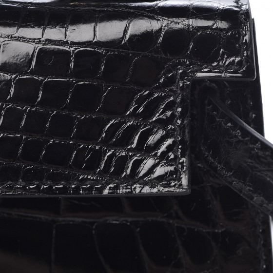 Detail: Hermes classic handbag is beautifully crafted in alligator skin leather in black. A single rolled leather top handle is secured with polished gold plated hardware and an optional leather shoulder strap. The traditional Kelly turn lock secures the small flap. The interior features a matching chévre goatskin leather with a single flat pocket.