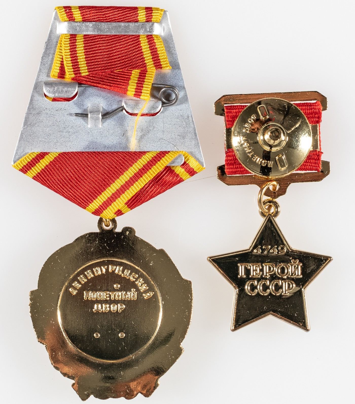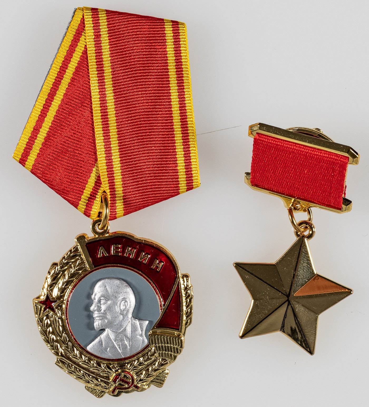 Lot of two Soviet badges, 'The Golden Star', 2.25 inches with ribbon, and the 'Order of Lenin', 3.5 inches with ribbon. Wearer's copies.