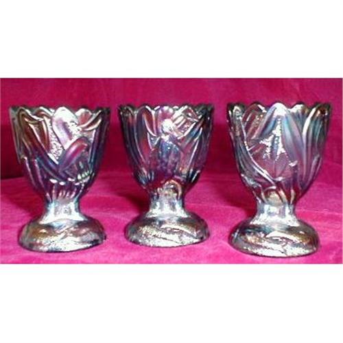 Three carnival glass pedestal cups. We believe the pattern may be called Heron & Cattail or Heron & Fish. Each has a heron