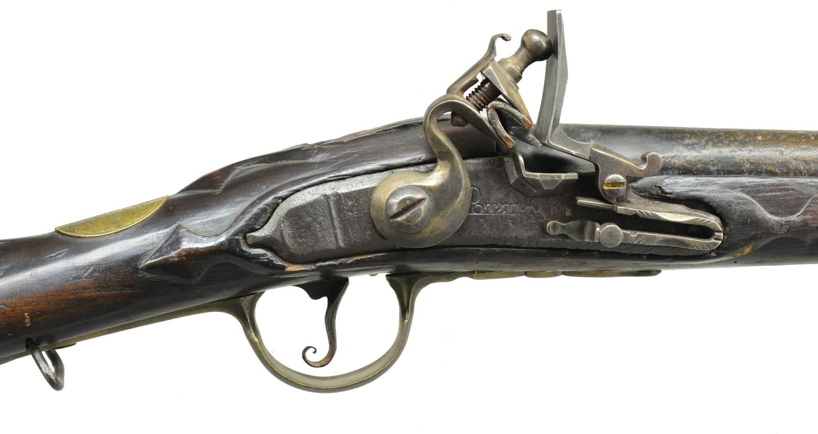 RECONVERTED FROM PERCUSSION. Cal. 79. NSN. Bbl. 41" w/ lg. brass front sight, has no visible marks. Touch hole reworked & bushed. Lock w/ flat faced Chamfered plate. Has file decoration at rear & is engraved "POTZDAMM" in front of serpentine cock. New cock, pan, frizzen & spring are installed. Walnut stock is pinned to bbl. & is of early handrail styling w/ flutes at comb that extend to heavy brass buttplate w/ very long crenellated top tang marked "A'N 2346" ?. Stock is relief carved w/ raised fields along bbl. channel as well as around lockplate, sideplate & top tang, which have arrow head finials. Other furniture includes heavy brass trigger guard, raised serpentine sideplate & oval escutcheon on top of grip marked w/ cipher "TR" under crown. Old hickory ramrod is held by 2 heavy faceted pipes w/ matching thimble. CONDITION: fair. Bbl. dark brown patina w/ a lg. amount of very deep pitting. Lockplate also brown & deeply pitted. Replacement parts somewhat aged. Stock has numerous repairs in lock area & at top around bbl. tang as well as many replacements & filler along bbl. channel w/ last 12" of stock at muzzle spliced in. Lock is operable. PROVENANCE: The Estate Collection of Gary Parietti. (01-19295/MGM). ANTIQUE. $1,500-2,000.