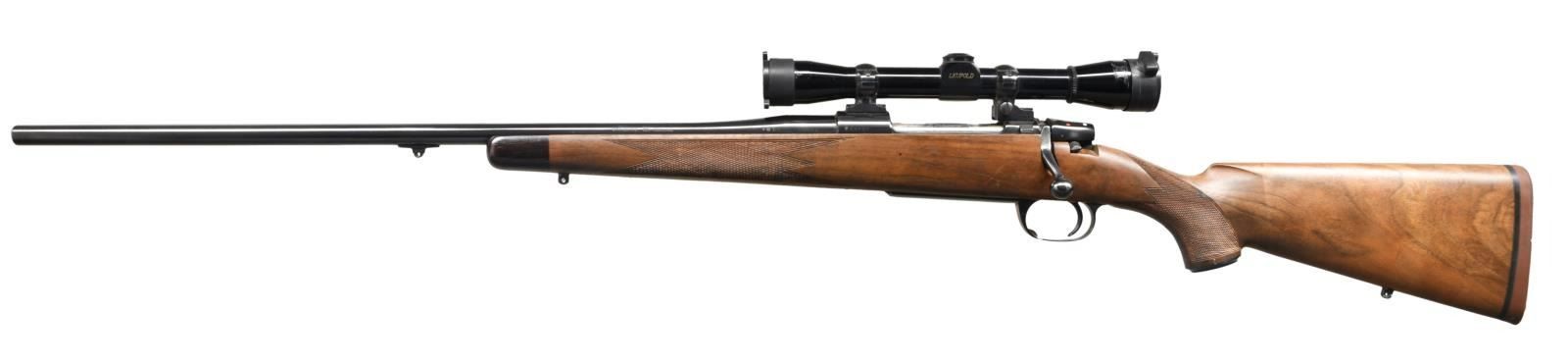 Cal 7mm Remington Magnum. S# 29822. Bbl. 26". Left hand action, blued finish, no provisions for sights & Leupold M8 4X rifle scope w/ duplex reticle & clear reticle. Internal magazine w/ release inside trigger guard. Checkered stock w/ rosewood tip, pistol grip w/ metal cap & raised cheek rest w/ sling swivel studs. Pachmayr recoil pad gives shooter a 14 1/8" LOP. CONDITION: metal retains about 95% original finish on Bbl. & frame. Floorplate has turned to a plum patina. Stock has several scattered dings, dents & scratches. Bore is very good, bright & strongly rifled. (23-2176/CW). MODERN. $600-900.