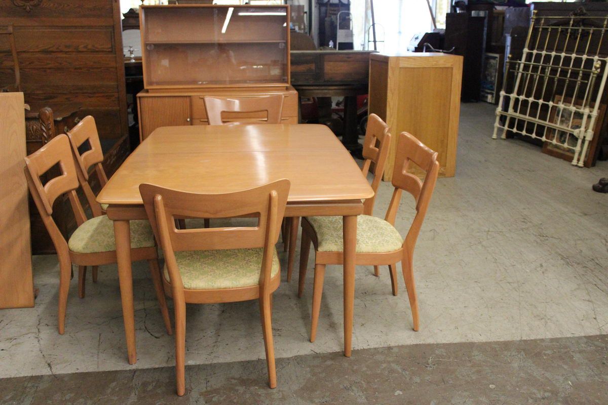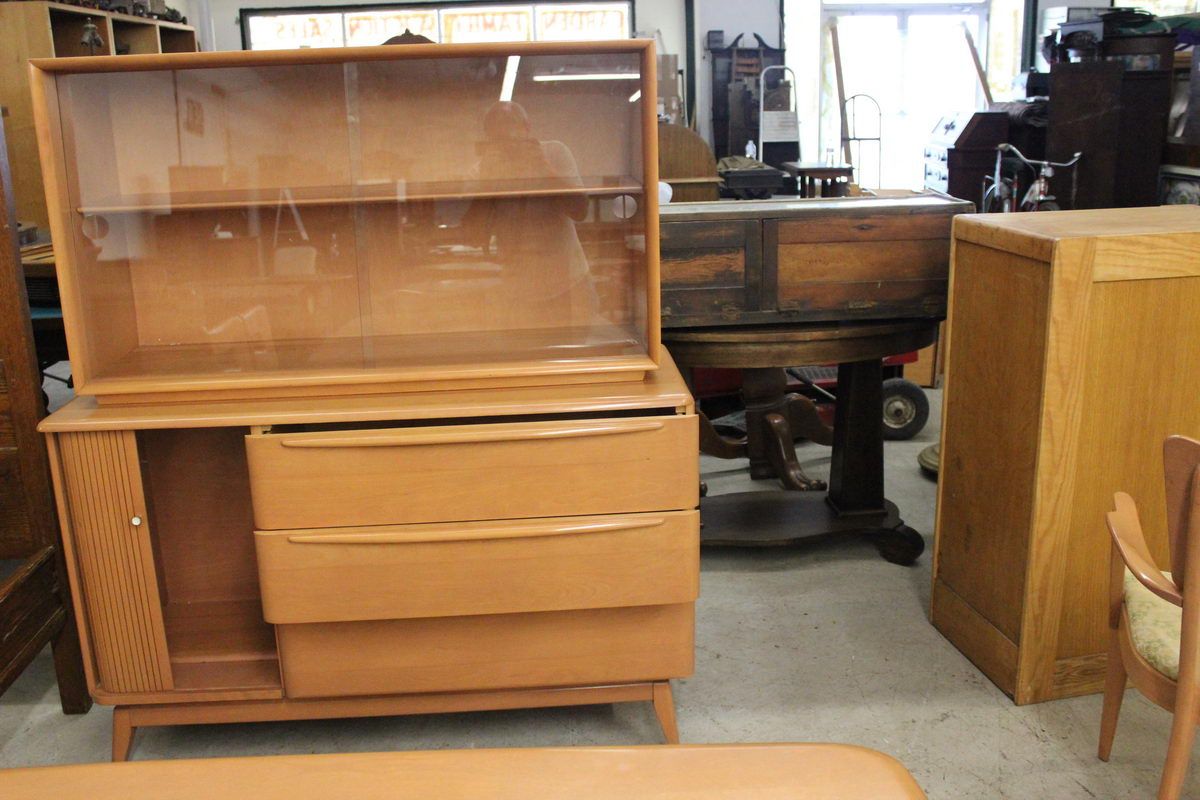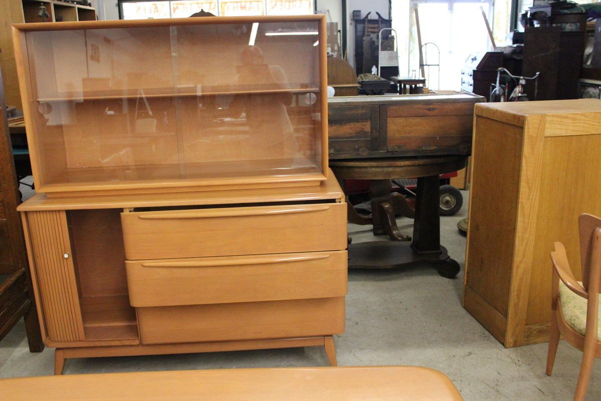HEYWOOD WAKEFIELD 8 PIECE DINING SET - CHINA SIDEBOARD W/ UNUSUAL TAMBOUR DOOR - CHAMPAGNE FINISH