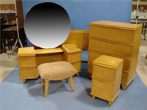 HEYWOOD WAKEFIELD FIVE PIECE BEDROOM SUITE. Wheat color. Consists of double bed, vanity w/mirror & bench, 4 drawer chest, 2 dwr. Night stand.