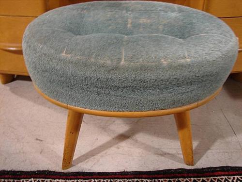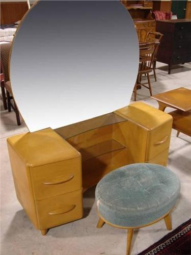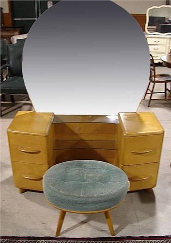 HEYWOOD WAKEFIELD VANITY & STOOL. Wheat color. Vanity has two drawers at each side and two glass shelves at center. Shows staining at left side. 61” H, 47” W, 18.5” D. Seat: 16” H, 23” Dia.