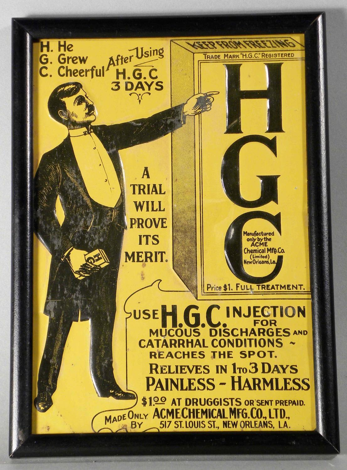 HGC Embossed Tin Sign. ACME Chemical Mfg. Co., New Orleans, LA. Very Good Condition. 6 1/2 X 9 1/2 inches.