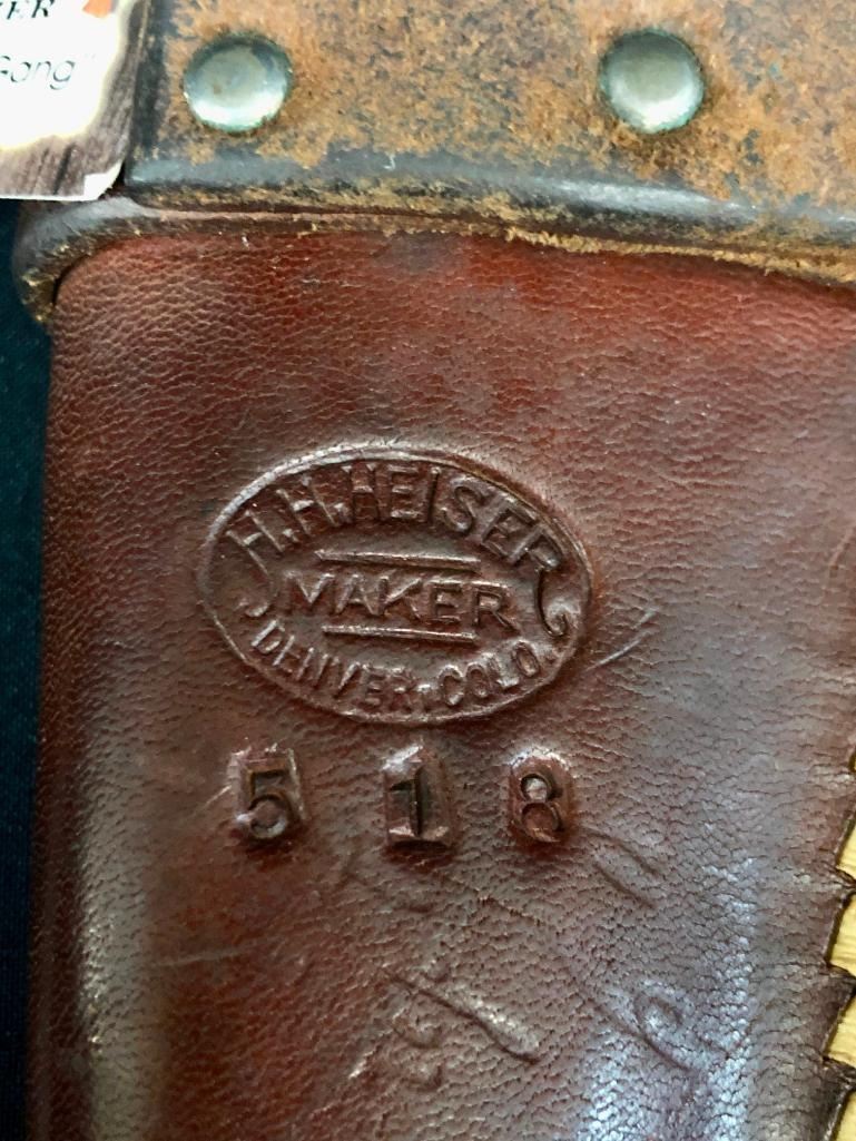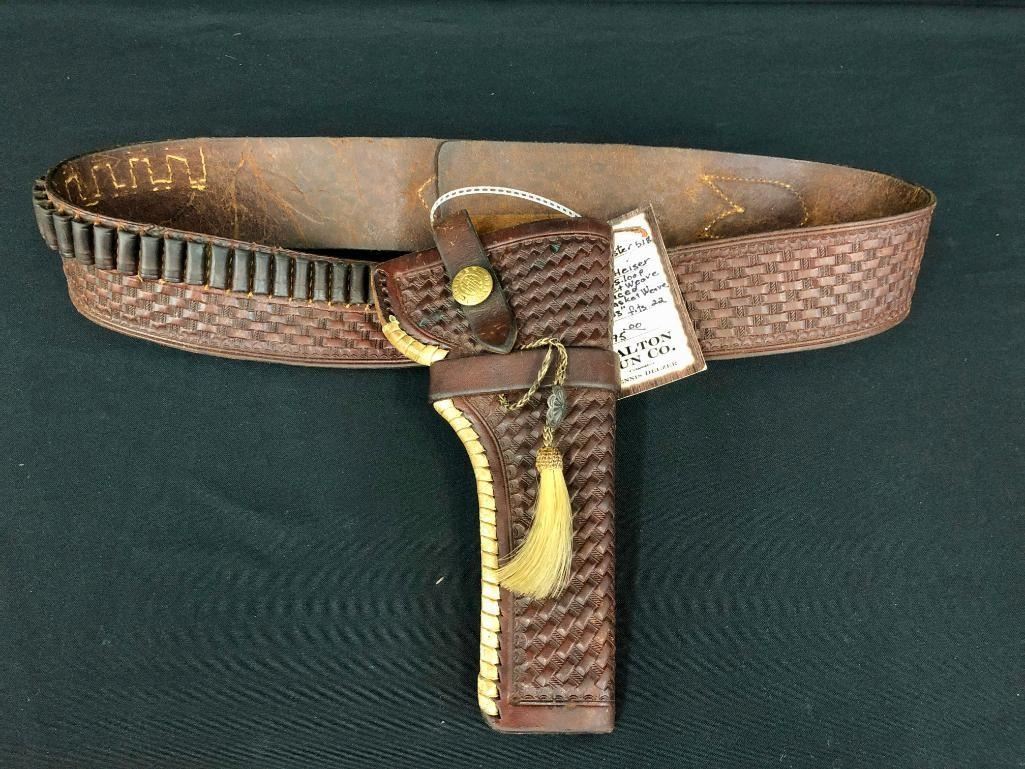 Up for consideration is an HH Heiser gun belt and holster with a basket weave design. It has horsehair and metal accents added. MAKER: Stamped, HH Heiser on both the belt and holster. APPROX AGE: Early to mid-1900s. SIZE: Belt is 40 inches long. Holster is 4 inches wide X 8-1/2 inches long. CONDITION: Good for its age, normal wear expected. Please look closely at the pictures as they are an important part of our description and are hereby incorporated into the description, specifically with regards to condition. SHIPPING: There will be a $8 handling / packaging fee for shipping this lot. The actual cost of postage will be added on top of that. BUY IT NOW: If you would like to buy this item now, without waiting for the auction day to bid on it, we do offer this option (which is available up to 48 hours before the actual auction starts). The “Buy it Now” price is the high estimate of this lot (plus applicable fees and the Buyer's premium is discounted to 10% when using the Buy it Now option). If you would like to exercise this option, you must contact us by email (or phone as long as you talk to someone live). Reference this lot number and your intention to "Buy it Now."