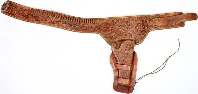 full floral carved, fits 32-36 waist, Colt SA 32 cal., nice quality rig with good condition. Est. 200-375