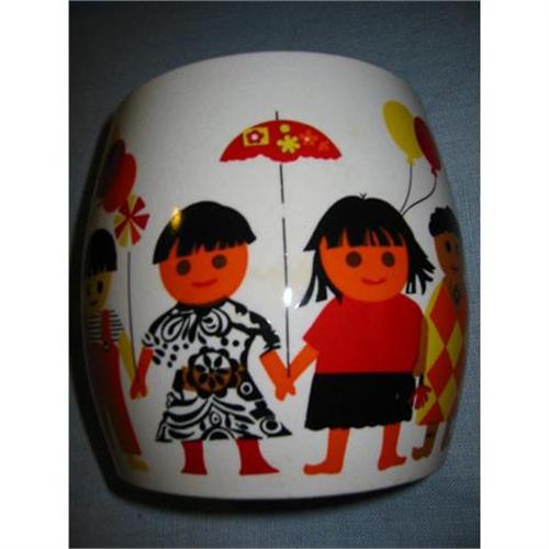 wonderful vibrant circle of friends. boys and girls holding hands and holding balloons smiling and wearing beautiful orange,yellow and red outfits accented with black and a japanese umbrela on off white background. the ceramic has crackle patterns and in excellent condition. great for decoration - plants or nick nack. the vase is 5.5 inch tall,5.5 in dima both sides. gold lable HH Japan.
