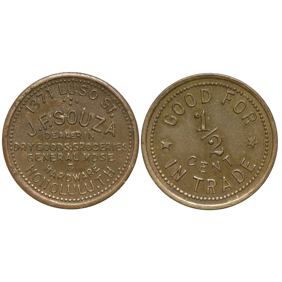 1371 Luso St. Dealer in dry goods, groceries, general mdse & hardware. GF 1/2c IT. Brass 21mm plain edge.