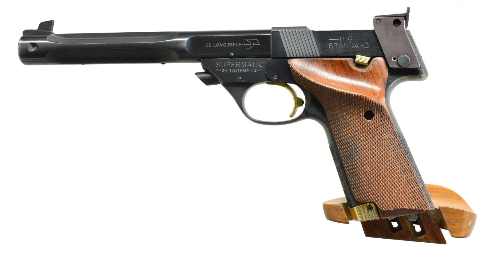 Cal. 22 LR. S# ML05453. Bbl. 7 1/4" fluted drilled to accept bbl. weight. Ramp mounted Patridge front sight w/ square notch adj. rear sight. Bbl. & frame having matching numbers. Frame features push button bbl. release. Gold finished serrated trigger. Stippled grip straps. Left grip panel is original checkered thumb rest style. Right grip panel is aftermarket w/ adj. palm rest. Top of the line Series 107 target pistol mfg. 1975. MAGS: 1 detachable 10 rd. CONDITION: over 80% metal finish showing carry & edge wear. Grips show sm. marks. Bright bore retains strong rifling. (21-1376/DS). MODERN. $600-800.