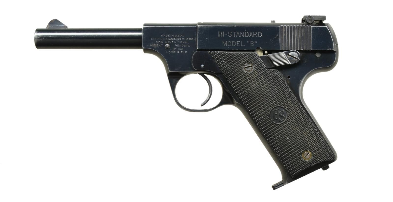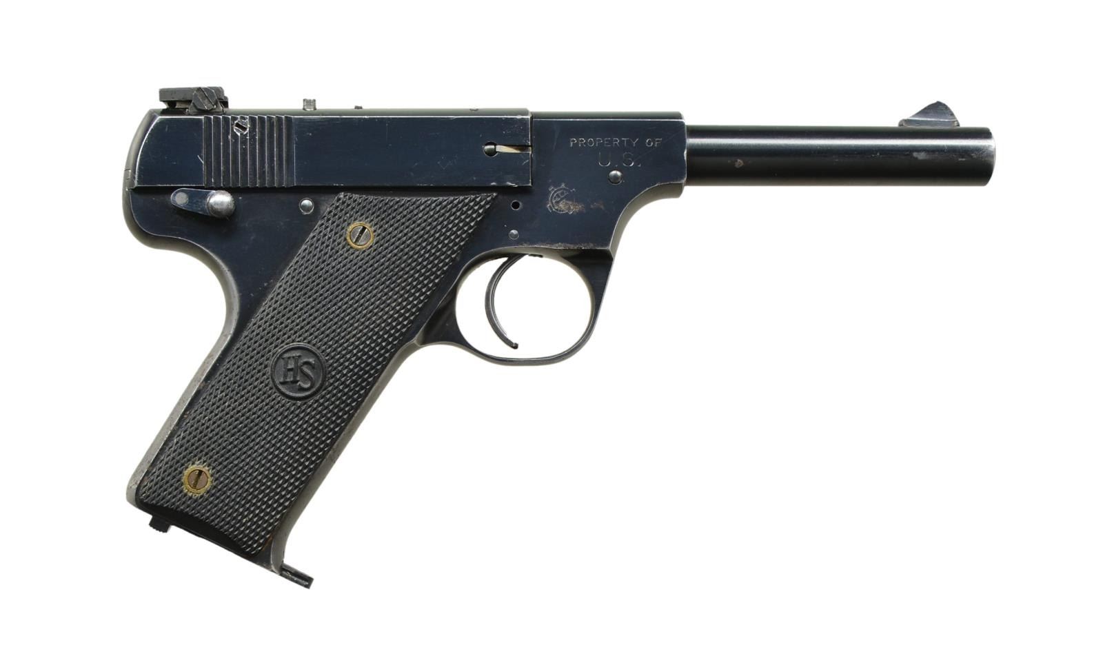 Cal. 22 LR. S# 99261. Bbl. 4 1/2" with serrated ramp blade sight; slide mounted rear replaced w/ adj. MMC sight having white outline blade; no slide alterations. Mfg. 1942-1943 having "PROPERTY OF US" on top of bbl. in small letters and again w/ larger writing on right front of frame along with crossed cannons proof. Type II takedown having lever on right & latch on top of slide w/ no protrusions at rear. Blue Book states US contour began at this S# progressing until S# 100972; all US marked usually between S# 92344 & 111631. Checkered HS logo hard rubber grips w/ brass screw bushings. Matching numbered slide. MAGS: 1 near excellent aftermarket 10 rd. CONDITION: very good general appearance w/ light edge wear, light marks on slide (top front & edge below extractor), some light spots of peppery oxidation at right front of frame plus right edges of grip frame & thinning in grip area with gray patina appearance. Very good to excellent grips w/ light oxidation on bottom right screw. Near excellent bore. (22-4272/NW). CURIO. $450-600.