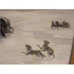 HICKS, WALTER PAINTING OF SLEIGH SCENE. Depicts two horse drawn sleighs in winter scene with two wolves. Small amount of damage at lower left. Signed at lower right. 49.75" x 32" framed.