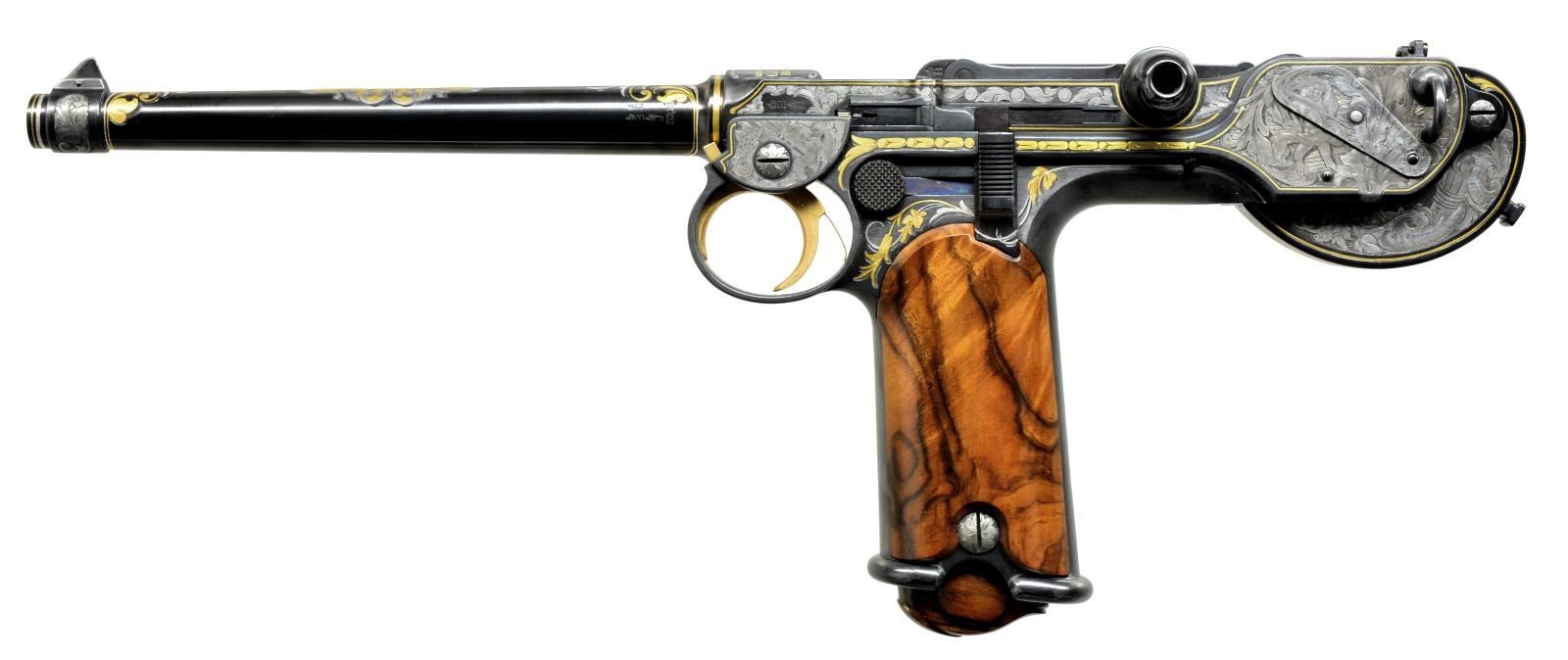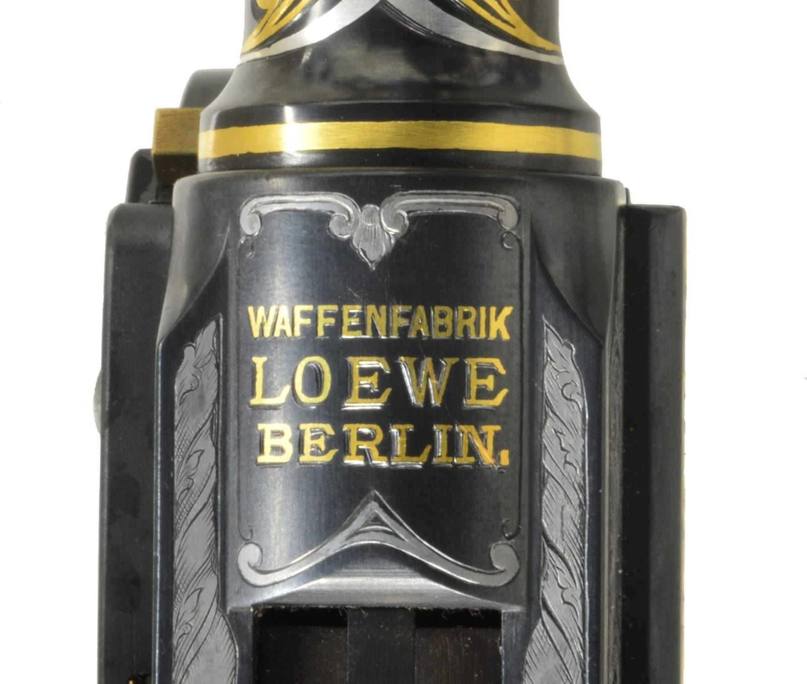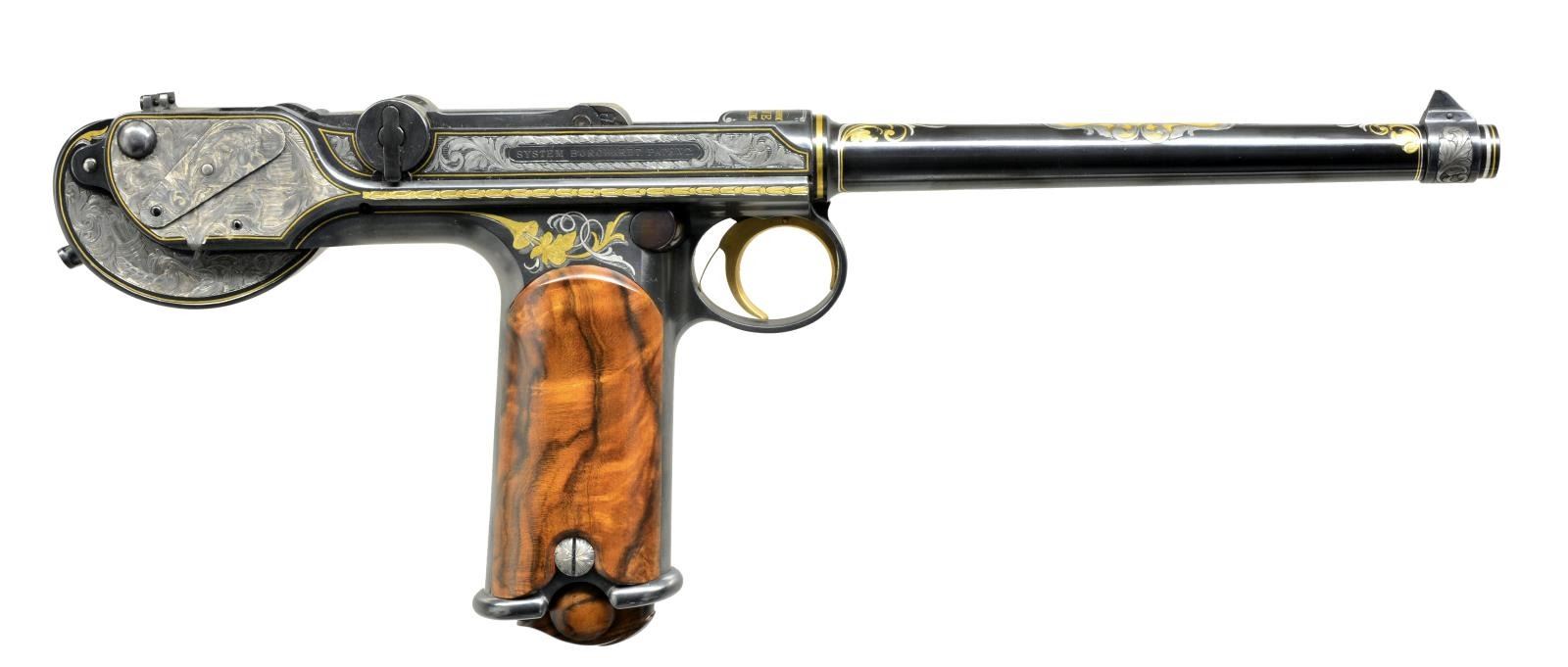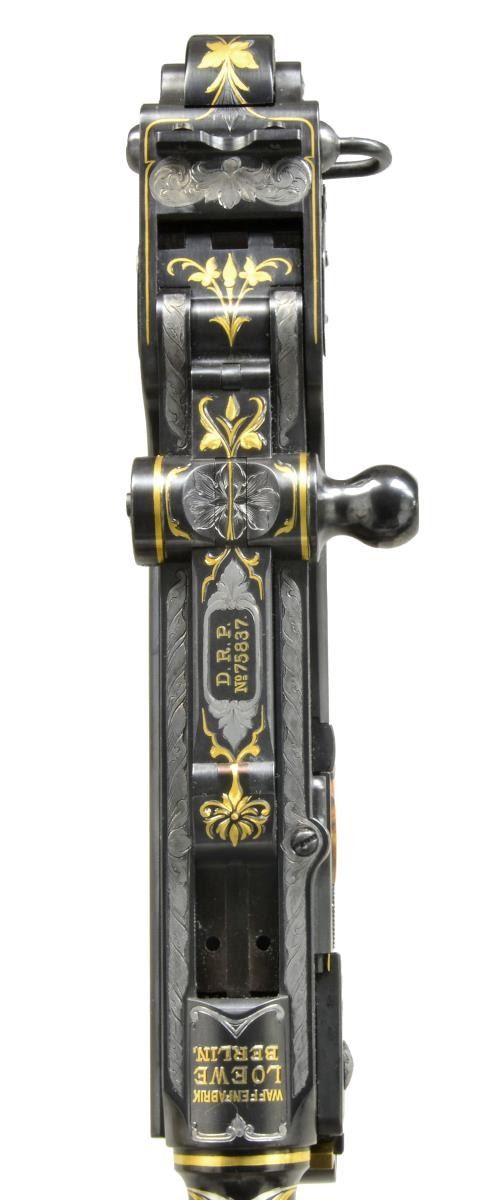SEMI AUTOMATIC PISTOL MANUFACTURED BY LOEWE, STOCKS BY STEVEN HEILMANN, ENGRAVED BY LEE GRIFFITHS. Cal. 7.65 Borchardt. S# 176. Classic C93 Borchardt pistol, strikingly embellished with superbly rendered gold & silver inlay accented scrolls on barrel & top of action with "WAFFENFABRIK LOEWE BERLIN" & "D.R.P. No. 75837" in gold as well. This fine gold & silver scroll melds into line borders on sides surrounding classic Germanic 19th century inspired scenes on rear of receiver; with bursts of acanthus scroll surrounding torso of spear wielding warriors, hunters, gargoyles on sides. Mainspring housing is inlaid with cornucopia & quivers of arrows. Grips & magazine bottom are of finely figured & veined Circassian walnut. They are superbly shaped & finished by master stock maker Steven Heilmann. The exceptionally fine engraving work is signed by the renowned Lee Griffiths & this pistol can be seen on Lee’s website leegriffithsengraving.com/handguns. Lee Griffiths of Utah Park, Utah is an internationally recognized award winning hand engraver. Lee started engraving with tools he fashioned from chunks of steel & a broken hammer in 1997. His passion for engraving & extraordinary artistic talent quickly led to recognition by the Firearms Engravers Guild of America (“FEGA”) as a Master Engraver in 1999. By 2002, Lee was teaching regular courses for engraving & artistic design. Lee’s work has continued to be praised by his peers. He has won the prestigious “Engravers Choice” award eight times at the FEGA Annual Exhibition (2007, 2010, 2011, 2013, 2014, 2016, 2017, 2019 ) along with over 30 “Best of Show” categories & awards of merit. Lee has also won gold medals at Concours d'Elegance of Fine Guns at the Vintage Cup, Millbrook, NY. Many of Lee’s guns are on display at the NRA Museum. CONDITION: exceptionally fine as custom finished. Metal parts retaining essentially all of satin rust blue. Grips & mag. bottom with nary a blemish in their fine oil finish. Bore is excellent. Mechanically fine. PROVENANCE: From the Frederic W. Thrane Collection. (01-18165/MGM97). ANTIQUE. $20,000-30,000.