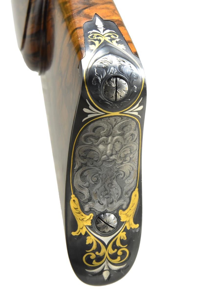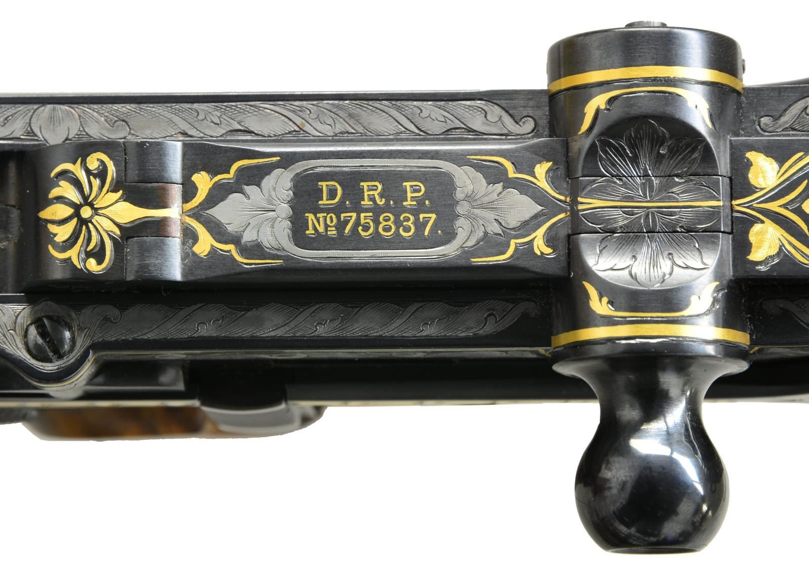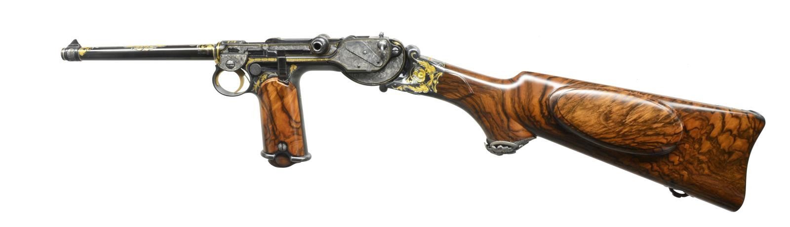 SEMI AUTOMATIC PISTOL MANUFACTURED BY LOEWE, STOCKS BY STEVEN HEILMANN, ENGRAVED BY LEE GRIFFITHS. Cal. 7.65 Borchardt. S# 176. Classic C93 Borchardt pistol, strikingly embellished with superbly rendered gold & silver inlay accented scrolls on barrel & top of action with "WAFFENFABRIK LOEWE BERLIN" & "D.R.P. No. 75837" in gold as well. This fine gold & silver scroll melds into line borders on sides surrounding classic Germanic 19th century inspired scenes on rear of receiver; with bursts of acanthus scroll surrounding torso of spear wielding warriors, hunters, gargoyles on sides. Mainspring housing is inlaid with cornucopia & quivers of arrows. Grips & magazine bottom are of finely figured & veined Circassian walnut. They are superbly shaped & finished by master stock maker Steven Heilmann. The exceptionally fine engraving work is signed by the renowned Lee Griffiths & this pistol can be seen on Lee’s website leegriffithsengraving.com/handguns. Lee Griffiths of Utah Park, Utah is an internationally recognized award winning hand engraver. Lee started engraving with tools he fashioned from chunks of steel & a broken hammer in 1997. His passion for engraving & extraordinary artistic talent quickly led to recognition by the Firearms Engravers Guild of America (“FEGA”) as a Master Engraver in 1999. By 2002, Lee was teaching regular courses for engraving & artistic design. Lee’s work has continued to be praised by his peers. He has won the prestigious “Engravers Choice” award eight times at the FEGA Annual Exhibition (2007, 2010, 2011, 2013, 2014, 2016, 2017, 2019 ) along with over 30 “Best of Show” categories & awards of merit. Lee has also won gold medals at Concours d'Elegance of Fine Guns at the Vintage Cup, Millbrook, NY. Many of Lee’s guns are on display at the NRA Museum. CONDITION: exceptionally fine as custom finished. Metal parts retaining essentially all of satin rust blue. Grips & mag. bottom with nary a blemish in their fine oil finish. Bore is excellent. Mechanically fine. PROVENANCE: From the Frederic W. Thrane Collection. (01-18165/MGM97). ANTIQUE. $20,000-30,000.