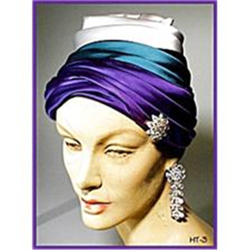 Spectacular vintage grey, green and purple silk "turban" hat with rhinestone pin. A very well made piece, inside tag reads Modern Miss. Excellent condition, circa 1940-50's.