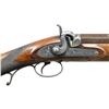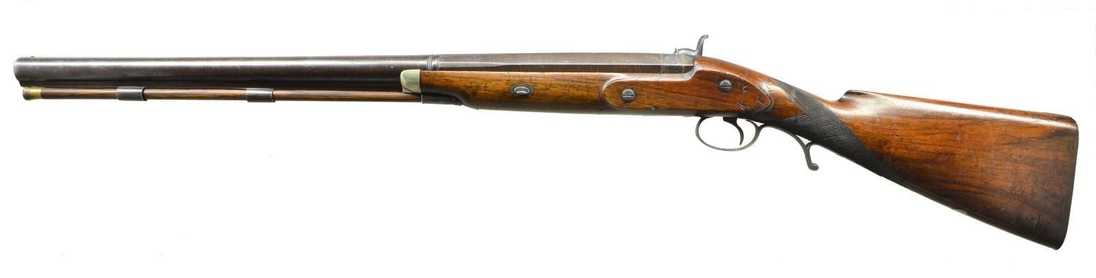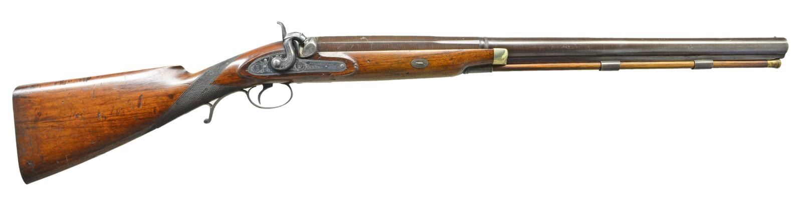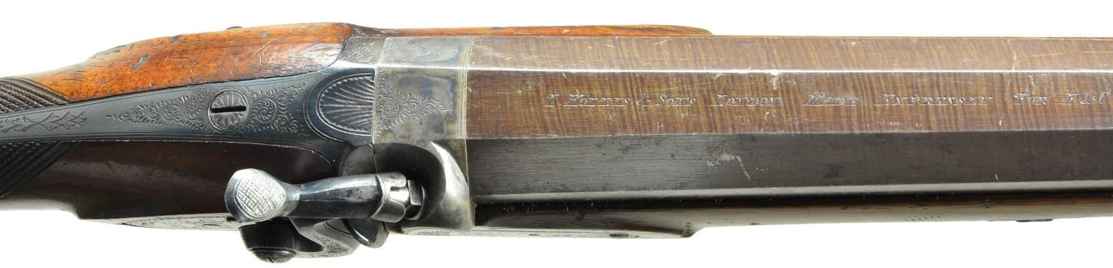 GUN BY I. HOLLIS & SONS. Cal. 8 bore (.838" bore diameter). NSN. 28" Bbl. with octagonal breech section which transitions to 16 sides and then to round through 1/2" wedding band. Top flat is engraved "I. Hollis & Sons London" and "Made Expressly For F&C". Bottom of bbl. is stamped with Birmingham black powder proofs and "8" (bore). Bbl. is fitted with steel underib. Case hardened breech plug has some rudimentary scroll engraving. Front spring island type percussion lock with large serpentine hammer has lockplate engraved with maker's name and some scroll, it also has two stamps: monogram "IHS" surrounded by "Makers to Her Majesty's War Department". Rifle is iron mounted, with the exception of a German silver nosecap. Trigger guard with stylized pineapple type finial has scroll on bow and checkered spur at rear forming grip. Lightly figured European walnut stock measures 14 1/8" over steel buttplate. Point pattern checkering is at grip and a vacant German silver oval is on toeline. Hickory ramrod with brass tip and tail mounts through two plain pipes and matching thimble. CONDITION: very fine, bbls. retaining about 90% original brown. Most case hardening color remains on breech plug. Iron parts retain nearly all of a rust blue. Stock retains over 80% of its oil finish over large amount of marks and dings, some quite heavy, especially on right side of butt. Bore is bright and shiny. Lock is crisp. Big bore guns such as this saw hard service in many remote parts of the world, and are seldom found in good condition. (01-21783/MGM). ANTIQUE. $2,000-4,000.