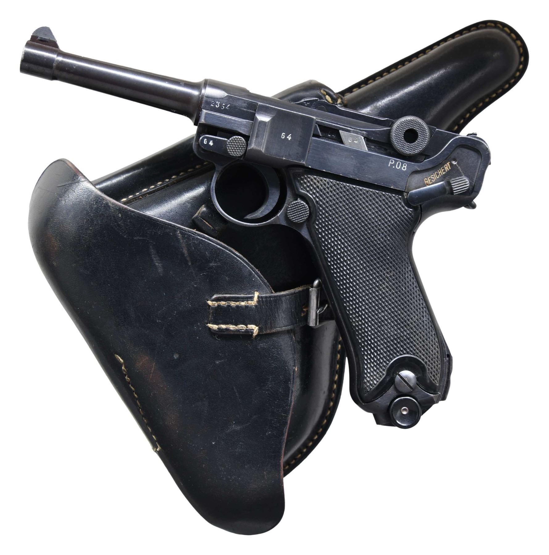 MAUSER "BLACK WIDOW" P.08 LUGER SEMI-AUTOMATIC PISTOL WITH HOLSTER. Cal. 9mm Para. S# 2364c. Bbl. 4". "Black Widow" P.08 Luger semi-automatic pistol mfg. by Mauser in 1942. The bbl. extension is marked with the 2-digit year of mfg. "42" over the chamber, with Mauser Eagle/135 arsenal proofs marked on the right. Toggle is marked with Mauser's clandestine "byf" mfg. code. Metal components exhibit an arsenal applied salt blue finish overall. Frame is mounted with 2-piece checkered black plastic grips. Standard blade front sight, with V-notch rear sight. All serialized parts are matching and include the frame, takedown lever, sideplate, trigger, safety lever & bar, bbl., bbl. extension, trigger bar, breechblock, extractor, firing pin, toggles, as well as the rear toggle pin. MAGS: 2 blued "fxo" marked mags. with black plastic bottoms. UNATTACHED ACCESSORIES: black leather holster marked "CWW", followed by an Eagle/WaA750 proof, "1942", and "P.08" on the rear. Holster contains a Mauser proofed loading tool. CONDITION: excellent, with metal components retaining bountiful amounts of their arsenal blue finish, exhibiting some spots of light wear and thinning, as well as some scattered spots of light pitting. Front grip strap appears to have been touched up at one time. Near mirror bore, exhibiting some light surface oxidation and pitting, while retaining well defined rifling throughout. Grips are good, showing some smoothing and a few nicks to the diamonds overall. Holster is very good, remaining malleable, and exhibiting some wear and scattered marks from handling and storage. An exceptional Mauser P.08 "Black Widow" Luger. (24-6885/MLW). CURIO. $2,500-3,500.