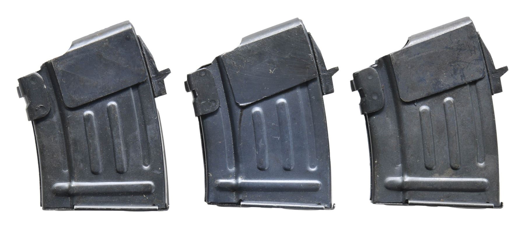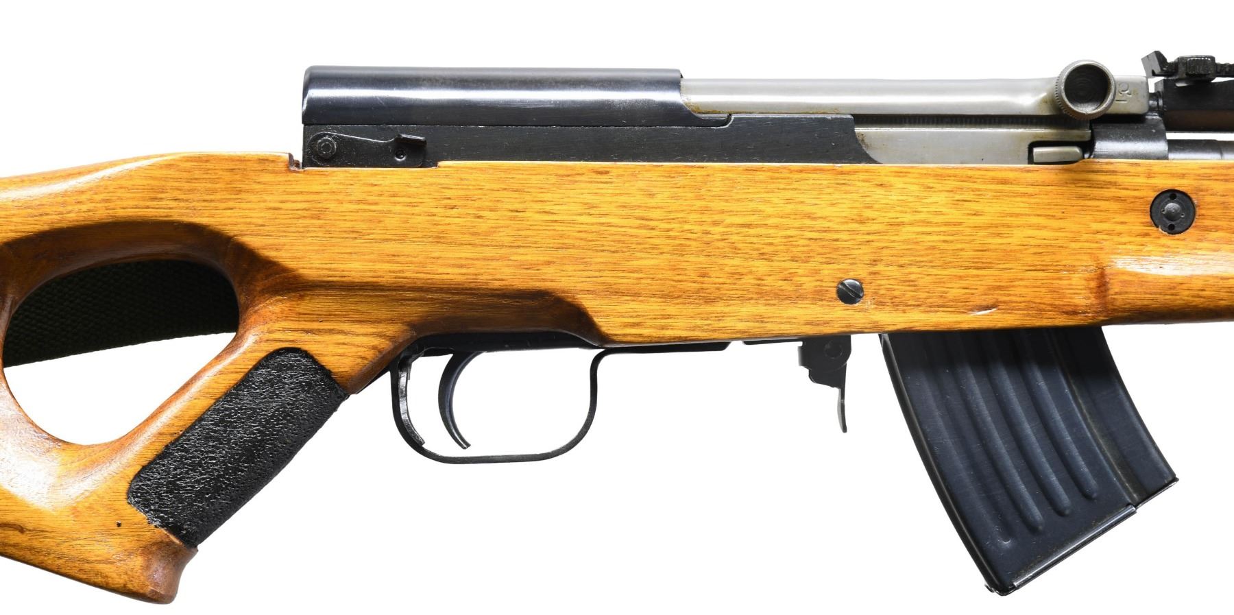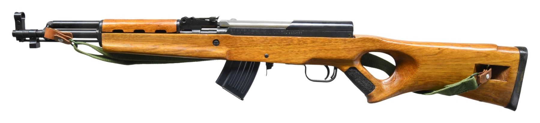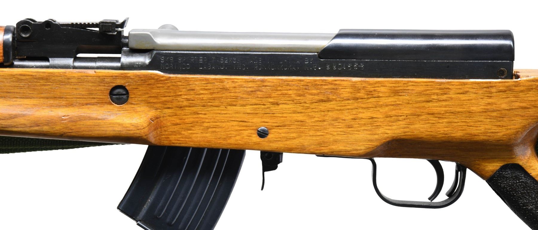 SEMI-AUTOMATIC RIFLE WITH SPARE MAGAZINES. Cal. 7.62x39mm. S# 8801553. Bbl. 16". SKS Sporter semi-automatic rifle mfg. in China by Norinco and imported by Labanu Inc. Left side of the receiver is marked with the model and cal. designations, as well as with mfg. and importer information, followed by the S#. Metal components exhibit a blue finish overall, save for on the bolt assembly, which exhibits a dull gray finish. 1-piece wood thumbhole stock with darkened textured panel on grip, flared forearm, and grooved black rubber recoil pad. Standard post front sight and U-notch leaf rear sight graduated 1-10. All serialized parts are matching and include the receiver and bolt assembly, with remaining components being unnumbered. Complete with cleaning rod and Chinese marked green canvas sling. MAGS: 1 10-rd. and 3 5-rd. mags. CONDITION: excellent, with metal components retaining virtually all of their original factory finish, showing a few light superficial handling marks overall. Brilliant mirror chrome lined bore, retaining well defined rifling throughout. Proper manual mechanics. Stock shows a few minor marks and impressions from handling and storage, with what appears to be a factory defect on the left side of the toeline. (25-4795/MLW). MODERN. $400-600.