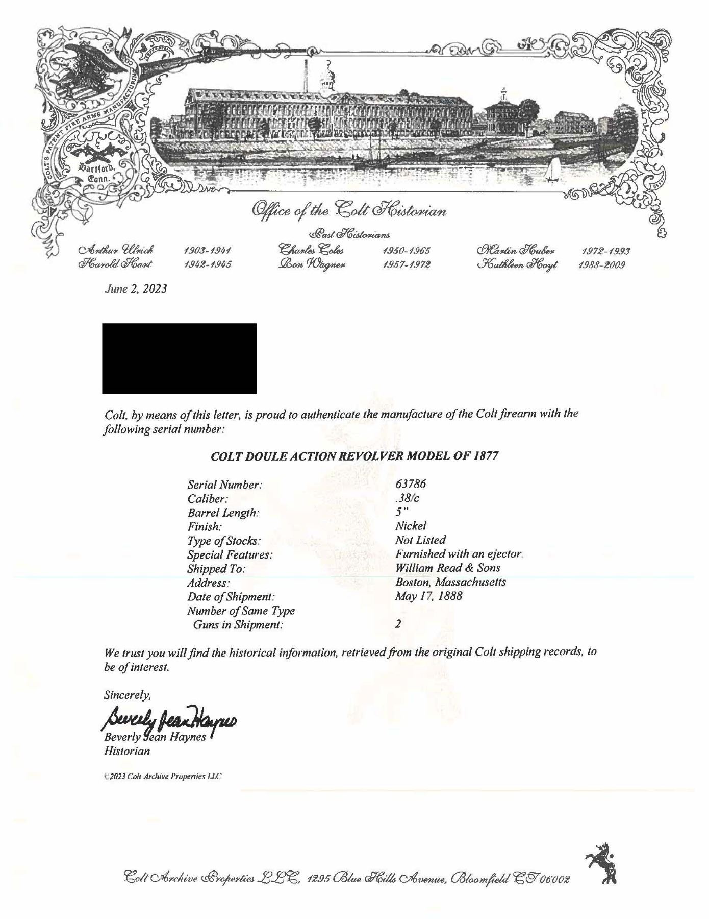 PANEL DOUBLE ACTION REVOLVER WITH FACTORY LETTER. Cal. 38 Colt. S# 63786. Bbl. 5". Model 1877 "Lightning" revolver mfg. by Colt in 1888. Left side of the bbl. is marked "COLT D.A. 38" within an etched panel, with Colt's 2-line address marked across the top. Left side of frame is marked with patent information. Major metal components exhibit a nickel plated finish, with the cyl. base pin, frame screws, grip screw, trigger, and rear strap of the hammer exhibiting a nitre blue finish. Frame is mounted with 2-piece Colt black checkered hard rubber grips. Half-moon blade front sight with frame notched rear sight. Bullseye ejector head. All serialized parts are matching and include the frame, cyl., trigger guard, and rear grip strap. Grips are matching via a handwritten "786" in white grease pencil on the interior of the panels. UNATTACHED ACCESSORIES: Colt factory letter stating "Serial Number: 63786/ Caliber: .38/c/ Finish: 5"/ Finish: Nickel/ Type of Stocks: Not Listed/ Special Features: Furnished with an ejector./ Shipped To: William Read & Sons/ Address: Boston, Massachusetts/ Date of Shipment: May 17, 1888/ Number of Same Type/ Guns in Shipment: 2". CONDITION: metal components retain the majority of their original nickel plated factory finish, showing some small spots/areas of flaking and wear that show through to dark oxidation, with a few small spots of light to mild pitting. Nitre blue parts show varying degrees of wear, with worn areas showing through to gray patina. Mirror bore, exhibiting a few small spots of light pitting towards the breech, while retaining well defined rifling throughout. Action functions appropriately when cycled by hand in SA and DA modes. Grips show light smoothing and a few superficial handling marks, but are otherwise very good overall. A high condition antique Colt Model 1877 "Lightning" revolver. (01-27265/MLW). ANTIQUE. $2,000-3,000.