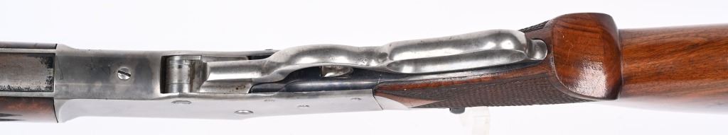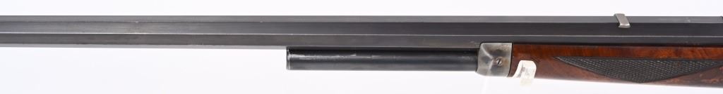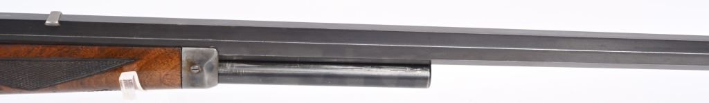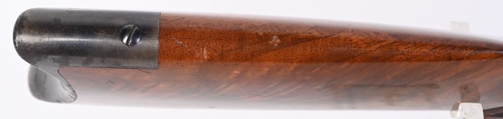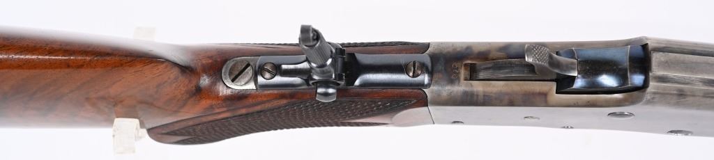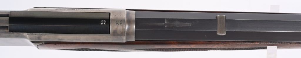 SERIAL 575. BARREL 28". CALIBER .40-75. . MADE 1886-1890. Arguably, the finest lever action rifles made during that era. There really was no standard model as you could order whatever you wanted but the deluxe versions were shipped with deluxe grain walnut, hand checkered pistol grip stock and fore-arm and then any feature you wanted. This example has the very scarce full octagon barrel with half magazine. The Bullard address is stamped on the left side of frame with caliber stamped on bridge. The frame , along with the lever and hammer are case color. The block is peacock blue. The rear sight has a filler and rifle sports a tang sight with standard bead front sight. Butt plate is blue rifle style. Due to the high price of manufacturing and the special attention to each and every rifle priced them out of the market in less than five years. Condition. One of the nicer examples you will find. Barrel retains 97% blue with sharp edges. There is a wear line where rear barrel sight was removed. The frame retains virtually all the case colors, most still bright. The hammer retains most of its original color as well. Lever shows some color on the sides. Butt plate still retains at least 75% of the high polish blue finish. Most of the screws still have generous blue and only a couple are lightly deformed. The wood is excellent with minor bruising. The bore is mirror bright. It's action is probably the smoothest of it's type ever built. A screamer high condition large frame. Even the dust cover retains virtually all the original high polish blue finish.. The nose cap also retains majority of case colors. ANTIQUE