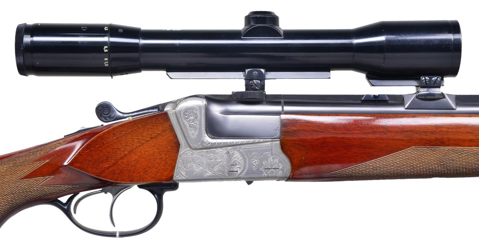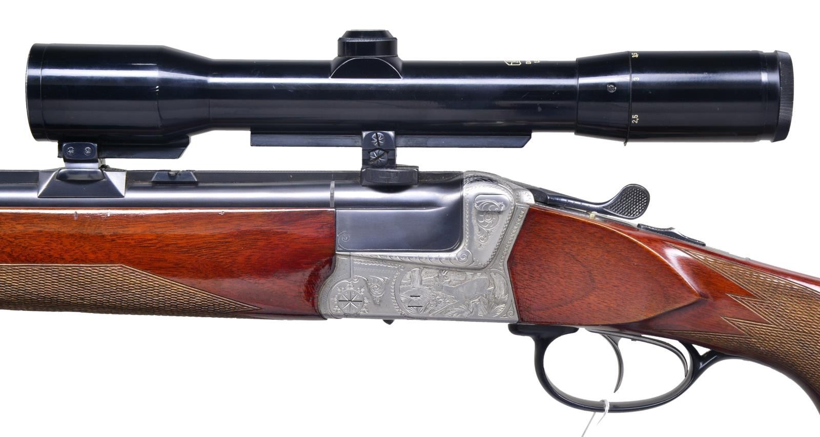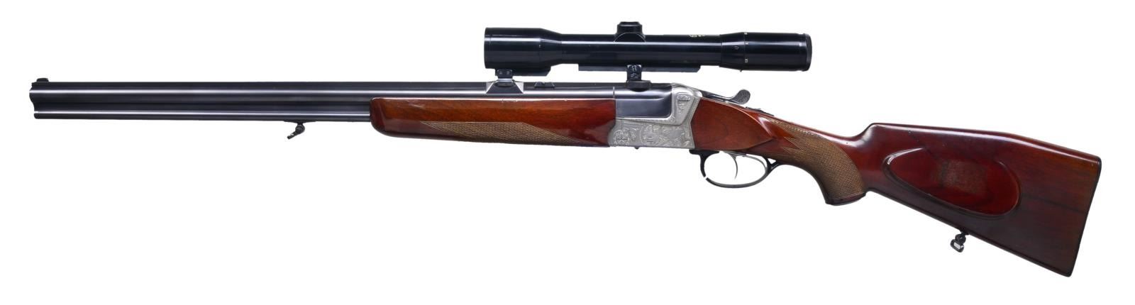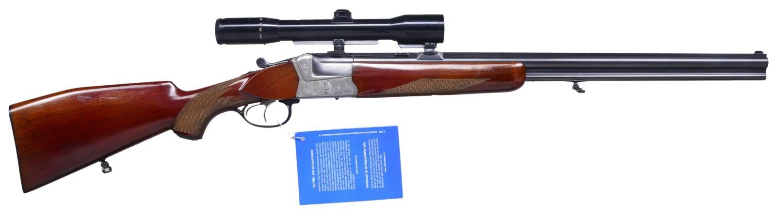 COMBO WITH ZEISS SCOPE AND SUB CALIBER TUBE. Cal. 16 Ga., 2 3/4" / 7x65R. S# 69582. The 25" monobloc bbls. fitted with full length solid matted rib have flip up U-notch rear and gold sourdough bead front sights. Claw scope bases are fitted. Bottom of monobloc is stamped with May 1970 Ulm Nitro proofs for 16 Ga., 2 3/4" / 7x65R rifle cartridge. Left side of rear lump is stamped "KRIEGHOFF" "ULM". Coin finished double Kirsten blitz o/u action features non-automatic safety, pin cocking indicators, and double triggers (both set). Action is engraved with sprays of scroll within small scroll borders which surrounds game scenes on sides. Roebuck running through open woodland is on left and prowling fox is on right. Aluminum trigger plate is engraved "KRIEGHOFF-TECK". Trigger guard is of black nylon. Capped pistol grip buttstock of plain European walnut has dark red finish as used by Krieghoff at that time and measures 13 7/8" over ribbed horn detachable buttplate with cartridge magazine underneath with space for 22 RF sub caliber tube which is currently installed in top bbl. Stock features hogback comb, shadowline right hand cheekpiece and multipoint pattern checkering at grip. Matching slim forend has Deeley release. Rifle is fitted with sling loops. Rifle is fitted with Zeiss "DIAVARI" 1.5-6x rail scope with three post reticle in claw mounts (rear with windage adj.). MEASUREMENTS: SHOTGUN BBL: Bore Diameter: .668". Restriction: .028 (IMOD). Min. Wall Thickness: .032". STOCK: DAH: 2 3/4". DA Rear of Hogback: 1 7/8". DAC: 1 5/8". LOP: 13 7/8" CAST: neutral. WEIGHT (without scope): 7 lb. 2 oz. UNATTACHED ACCESSORIES: comes with black plastic case. CONDITION: exceptionally fine, appears close to "new" with evidence of very limited firing and only a few scattered handling marks in metal and wood finishes. Wood finish shows light overall checking and an area of lifting on left side of comb. All bores are bright and shiny including sub caliber insert. Action is very tight, mechanically crisp. Scope is also very fine, with only one or two minor marks in exterior lacquer. Optically clear. (22-4951/MGM). CURIO. $2,000-3,000.