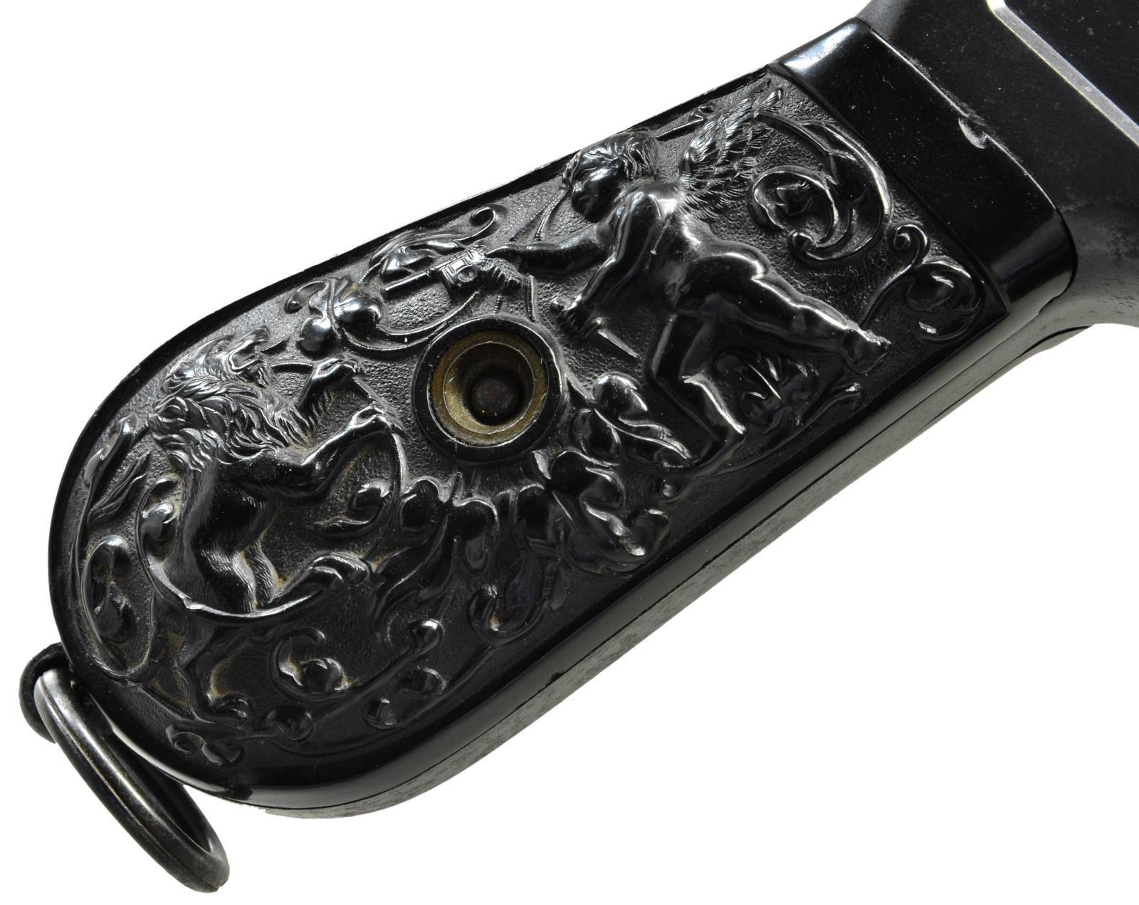 COMMERCIAL, ANGEL GRIPS, FACTORY MATCHING STOCK.Cal. 7.63mm. S# 35903. This is one of the earliest Prewar Commercial pistols that was assembled w/ a long extractor. This example having a 5.5" bbl., w/ a fixed front sight sight & a slip-in rear sight graded 50-1000. Long extractor, dual lug firing pin & SR hammer. Top of chamber w/ usual Mauser address. Full S# on left chamber flat. Left side bbl. extension has Crown/"C" /"U" mark; antler proof on right side. Frame w/ 2-line Mauser address. Fitted w/ hard rubber molded grips depicting Angel using a C96 to shoot a rearing lion. Lanyard ring present. Major components rust blued. Most sm. parts fire blued; trigger strawed; bolt, hammer & sub frame in the white. Complete disassembly shows fully matching parts, each of the grips hand-inscribed w/ full S#. UNATTACHED ACCESSORIES: complete w/matching original stock w/ full S# on upper arm of lug. CONDITION: approx. 97-98% original rust blue, most of the loss reflected by fine scattered flecks of oxidation rather than wear. Pinpoint speckled losses over the extractor, cursor & bolt stop as imaged. Trigger w/ expected fading in areas of contact. Very bright bore w/ sharp rifling. Perfect manual mechanics. Stock VG-excellent having most original finish, scattered handling marks; near excellent lug; hinge w/considerable fading. A wonderful, early, Prewar Commercial, still with the long extractor, better yet w/ Angel grips & a factory matching stock. (22-3083/LMA). CURIO. $5,500-7,500.