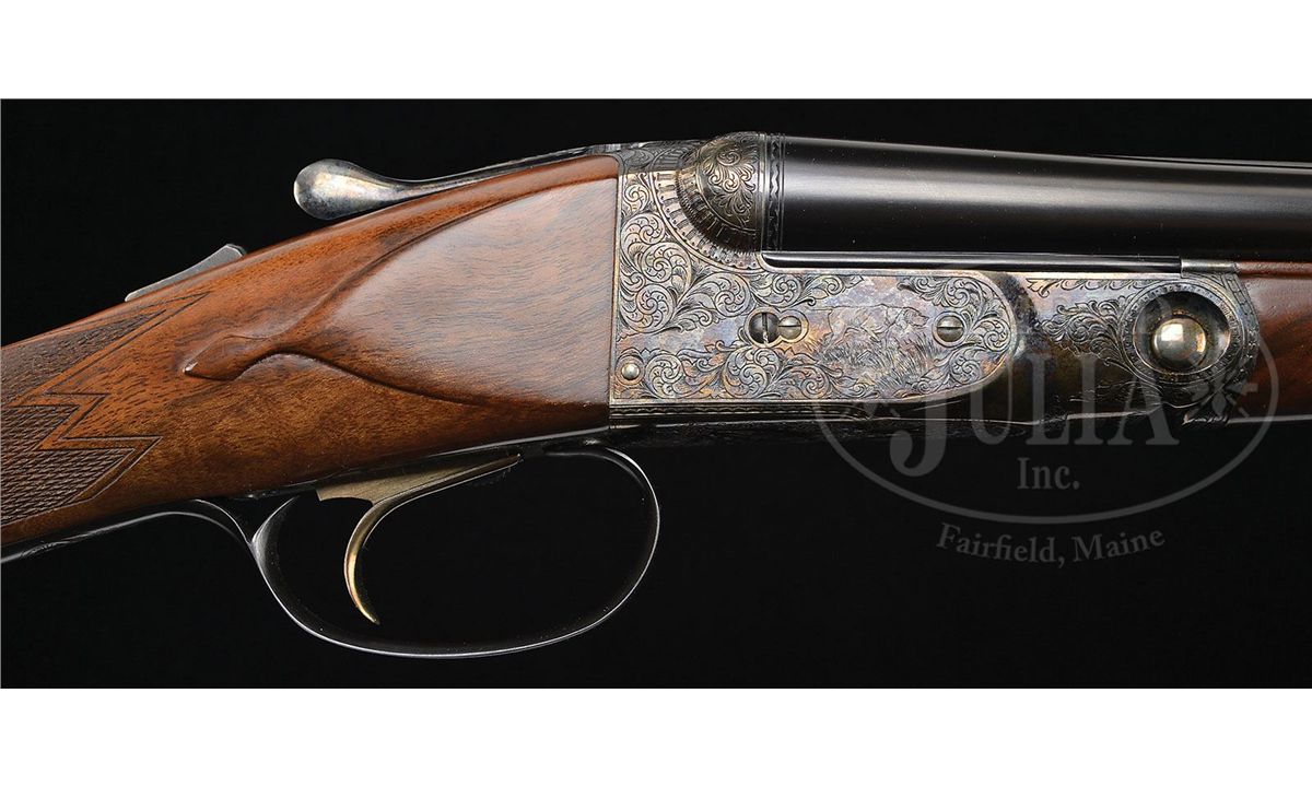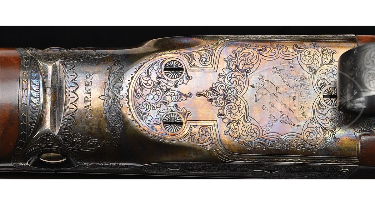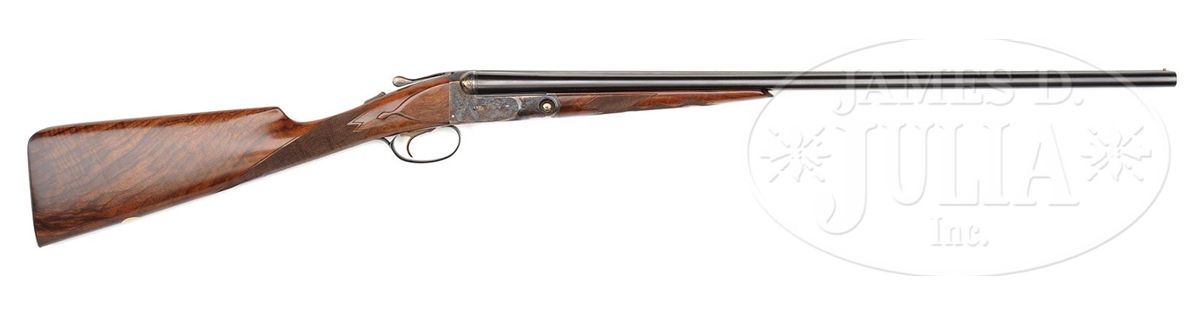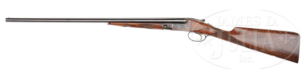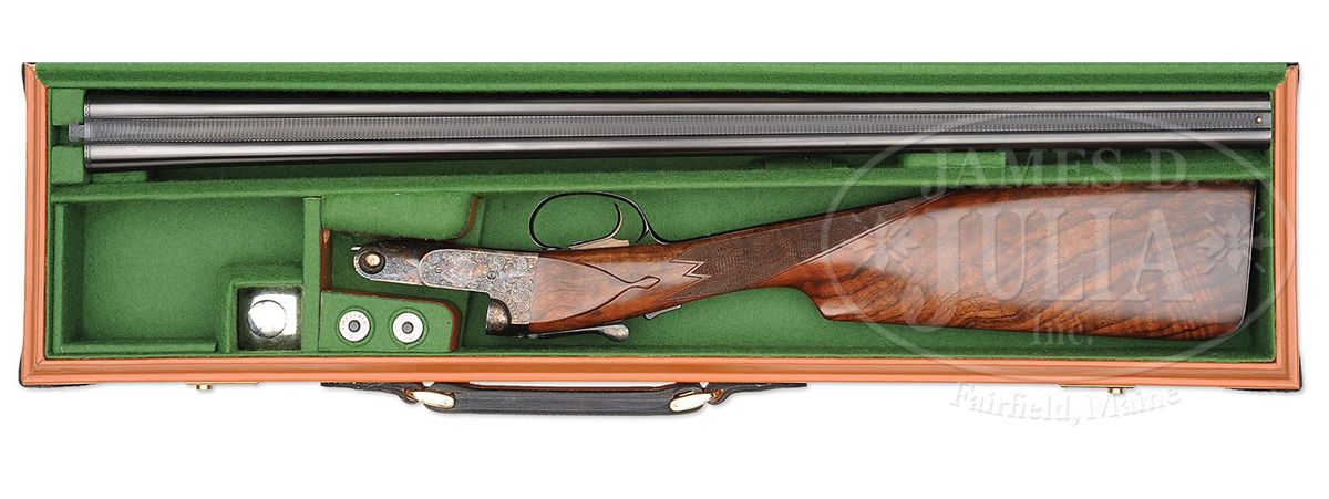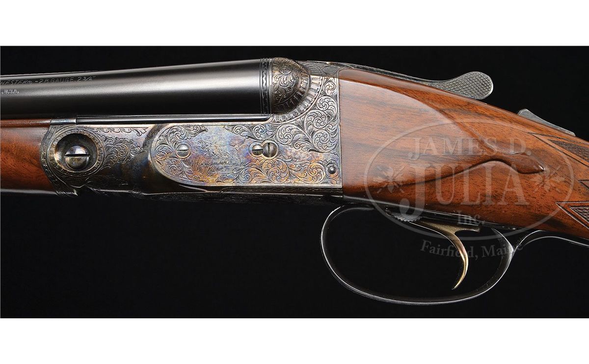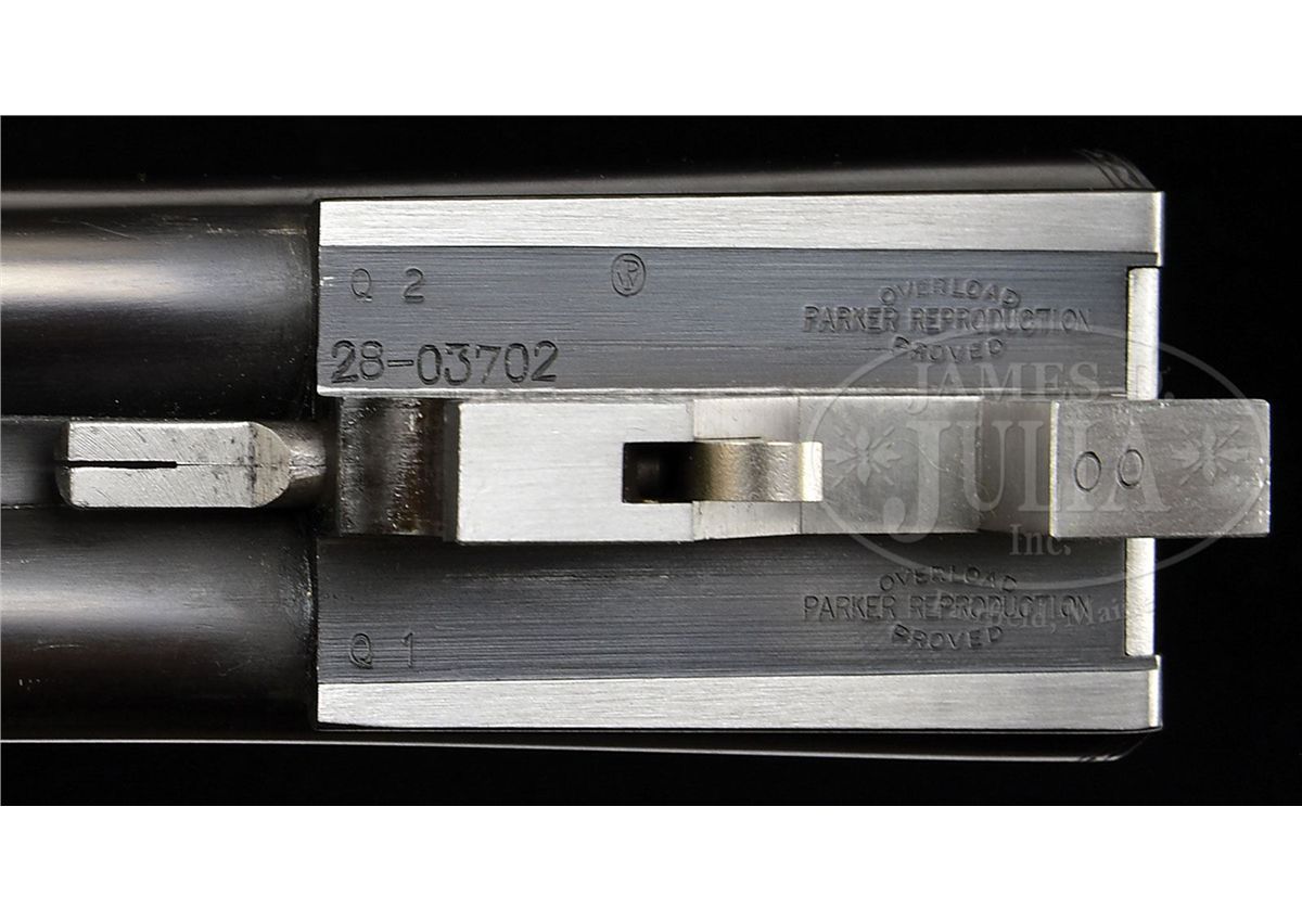 SN 28-03702. Cal. 28 ga. 2-3/4" Chambers. 00 Frame. Standard production gun with usual markings on bbls, bbl flats, and lumps. 26" bbls have straight grip stock, splinter forend, single trigger, and skeleton buttplate. Wood is beautifully fiddle figured and nicely veined. Bore diameter: left-.552, right -.553. Bore restrictions: left -.012 (Mod), right -.004 (IC). Wall thickness: left -.025, right -.025. Drop at heel: 2-1/16", drop at comb: 1-1/4". Weight: 5 lbs. 6 oz. LOP: 14-1/4". Parker Reproduction case with canvas outer cover, is lined in light green cloth, and has Parker reproduction and Emmebi labels on lid. Case contains square oil bottle, Parker marked snap caps, and two keys. Original white cardboard shipping box has label for this particular gun. CONDITION: Excellent, essentially as new, unfired. Case color is near 100%, and with only one or two of the faintest marks on wood. Case is excellent. Box has crack on one side of top and a corresponding wrinkle on the other. Label is slightly darkened. 4-48985 MGM99