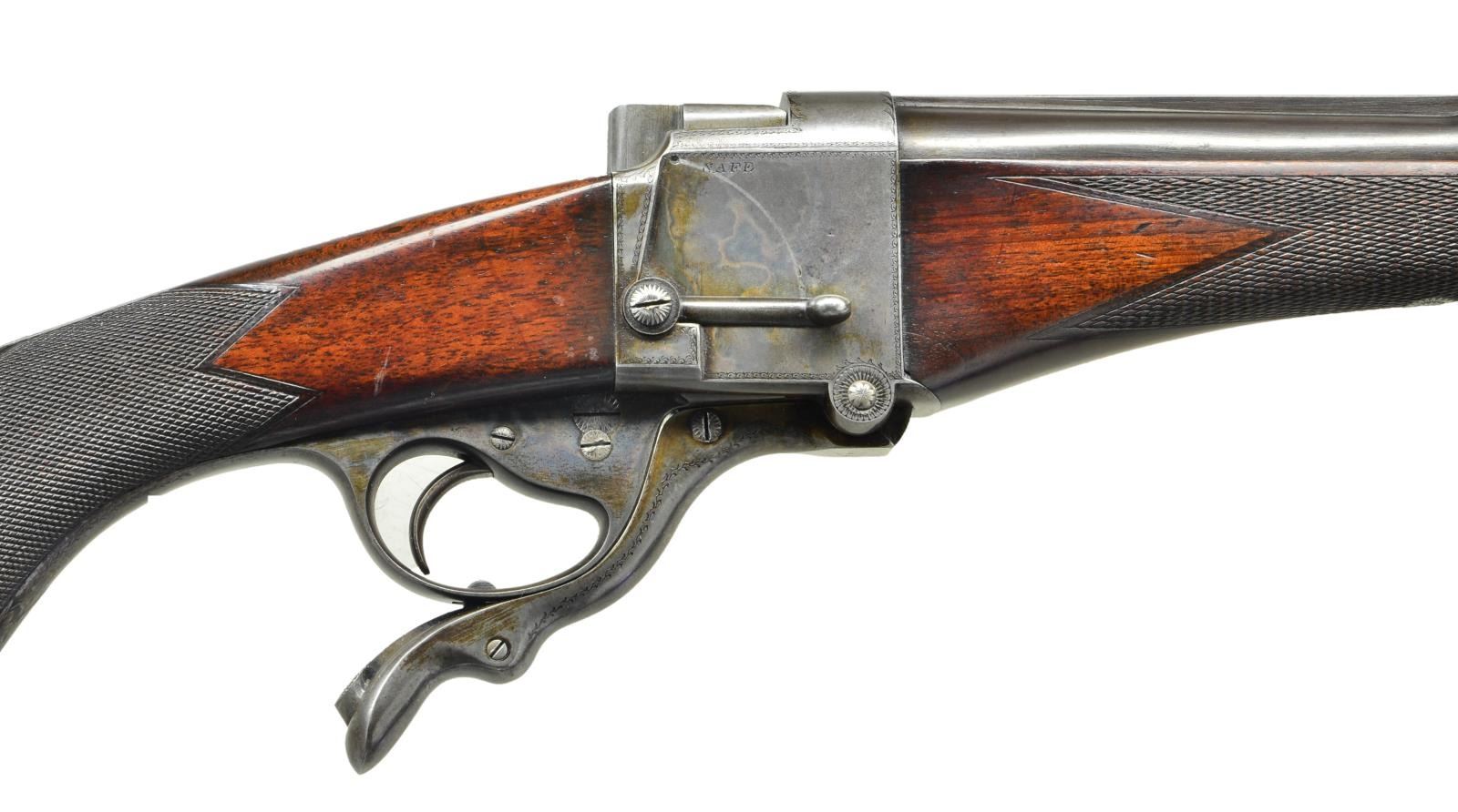 SHOT DROPPING BLOCK RIFLE WITH RIBBED BARREL. Cal. 303 British. S# 5843 (1897). Bbl. 25 1/2" is fitted with full length matted integral rib. Rib is milled such that one standing, 5 folding leaf rear sight is held by a broader portion of rib to give full support. Silver bead front sight is longitudinally dovetailed into slightly wider portion of rib at muzzle. Birmingham black powder proofs are at breech end with additional marking "31GRS Cordite MAXm". Case hardened Jeffery type 1 dropping block action is engraved on left side with circular belt and legend: "W. J. JEFFREY & CO. 13 KING STREET St. JAMES'S STREET". The central portion is engraved "London" "5843". Otherwise, action has border engraving of small scroll. Right side has pivoting safety lever and is engraved "SAFE" at top position. Serial number is also on base of operating lever. Top tang is drilled and tapped for special Lyman sight which was often supplied by Jeffery. Horn capped pistol grip buttstock of nicely marbled European walnut measures 14" over checkered steel buttplate with trap (trap holds cleaning rod). Point pattern checkering is at grip and a sling eye matching that soldered to bottom of bbl. is on toeline. Matching slim forend with horn tip screws to bbl. and is of Turner style (Thomas Turner produced many Farquahrson rifles for Jeffery). CONDITION: very fine. Bbl. retaining about 70% original blue turning to brown overall and with some sharp edgewear. Action retains 70-80% original case hardening color which has somewhat faded and also shows silvering on high edges and tangs. Stocks retain most of an old oil refinish over many marks and scratches. Checkering is lightly worn and has not been recut. Bore is good with strong rifling throughout; dark in grooves. Action is smooth. When on "SAFE", hammer will partially fall. Safety cannot be operated until rifle is recocked. (01-21687/MGM). ANTIQUE. $6,000-7,500.