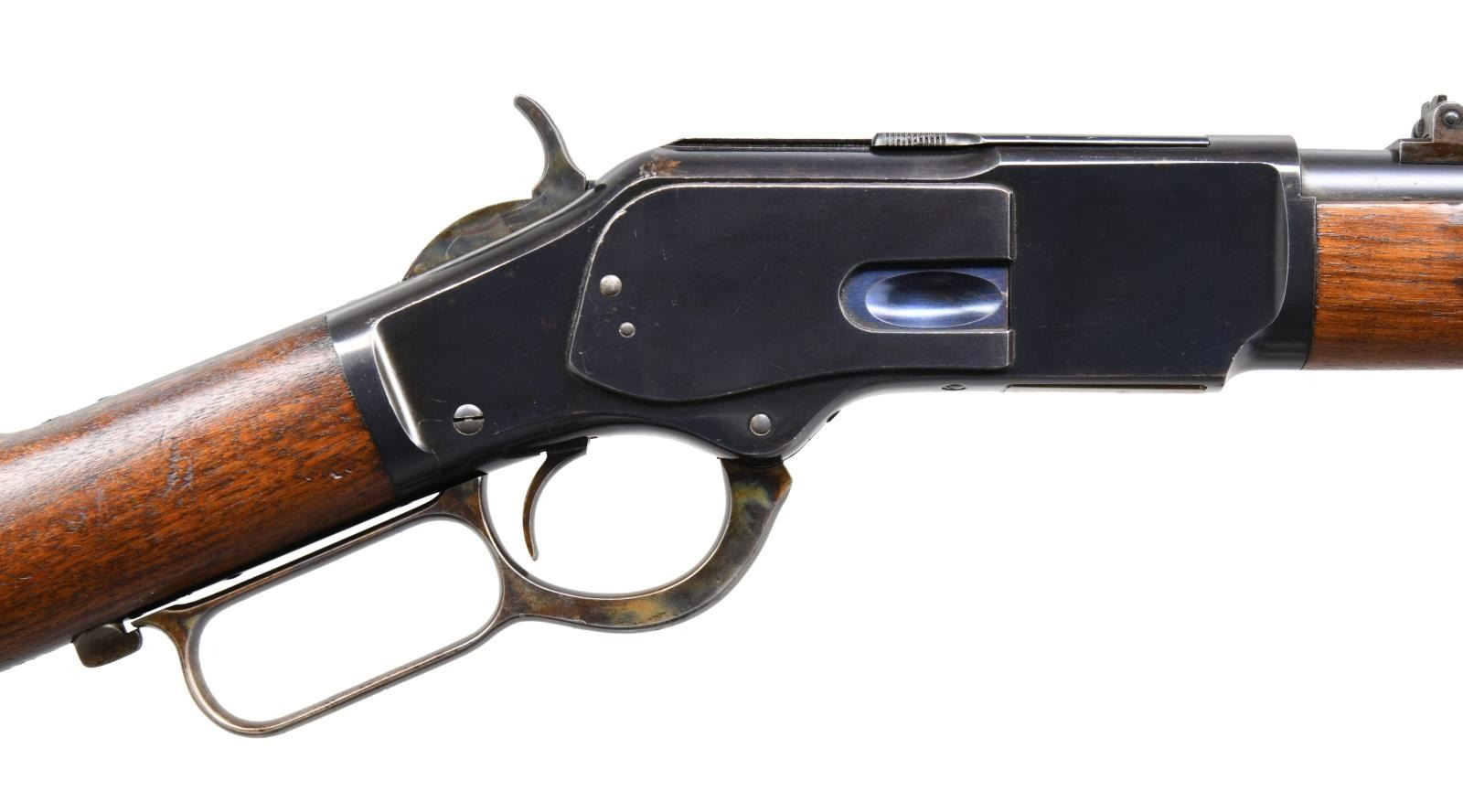 MUSKET WITH CODY LETTER. Cal. 44-40 W.C.F. S# 571281. Bbl. 30". Model 1873 lever action musket mfg. by Winchester in 1903. The top of the rnd. bbl. is marked "WINCHESTER'S REPEATING ARMS. NEW HAVEN. CT./ KING'S IMPROVEMENT PATENTED MARCH 29. 1866. OCTOBER 16. 1860.", with the cal. designation "44 W.C.F" stamped over the top at the breech. Receiver, bbl., and bbl. bands exhibit their original factory blue finish, with the lever, hammer, and buttplate exhibiting their original factory case color hardened finish. Smooth American walnut straight grip buttstock with full musket length forearm. Blade front sight with ladder rear sight. Buttplate features a brass trapdoor. Cleaning rods are not present. UNATTACHED ACCESSORIES: Cody Firearms Museum letter indicating that the S# was applied on August 19th of 1903, the rifle was received in the warehouse on September 15th of 1903, and was then subsequently shipping from the warehouse on September 18th of 1903 (Order Number: 13880). CONDITION: metal components retain bountiful amounts of their original factory blue finish, exhibiting some superficial handling marks and some concentrated spots of light to mild wear (primarily on the 2 rearmost bbl. bands and around the muzzle) that show through to gray and brown patinas, with a few small scattered spots of light pitting and surface oxidation overall. Lever and hammer retain the majority of their original vibrant case color hardened finish, with the buttplate exhibiting wear overall and retaining fair to good amounts of case coloring on the tang. Brilliant mirror bore, exhibiting well defined rifling throughout. Wood furniture shows scattered marks and impressions from handling and storage, but otherwise presents nicely and remains sturdy and serviceable. An extremely attractive and high condition example of a Winchester Model 1873 musket. (24-1470/MLW). CURIO. $5,000-8,000.