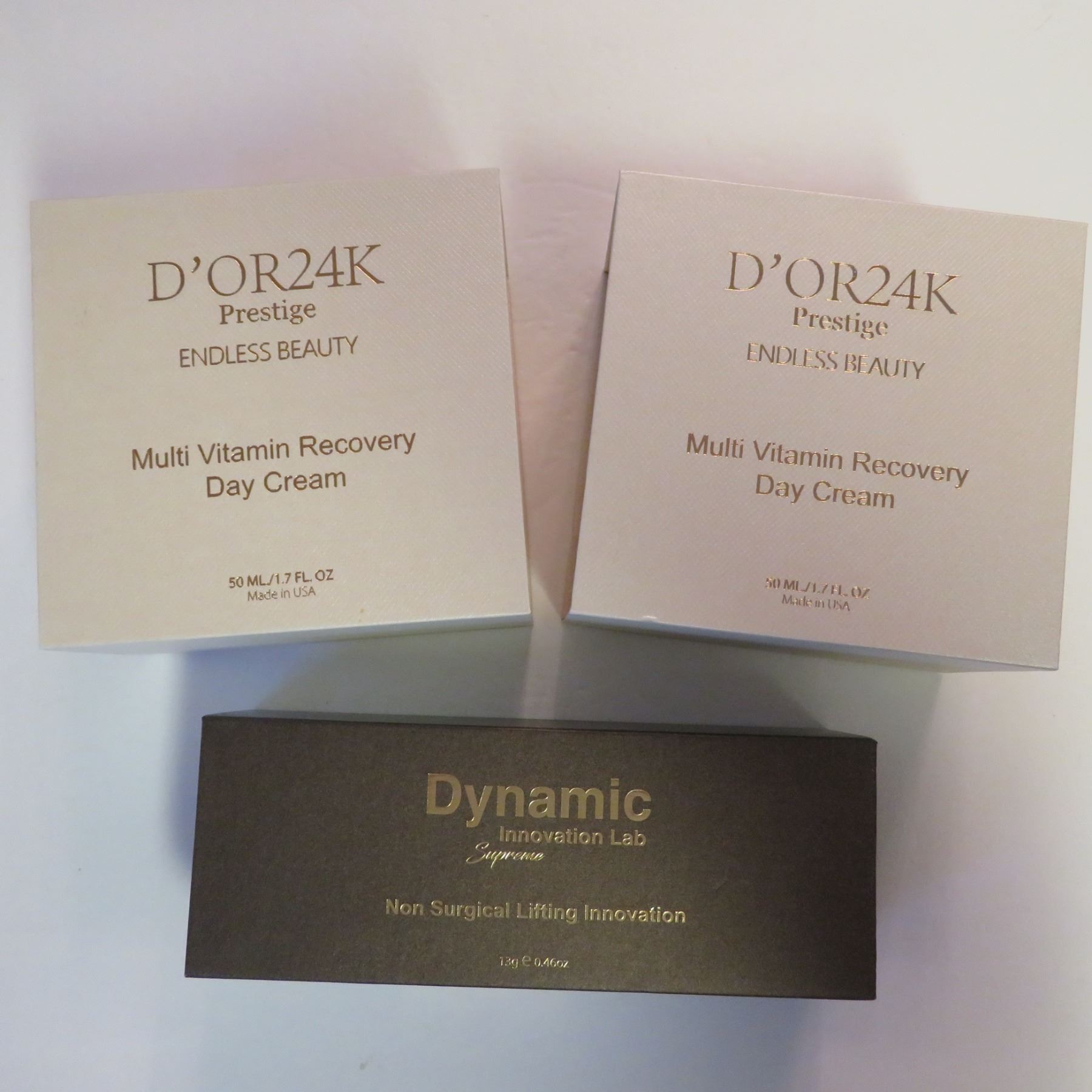 Includes 2 boxes of D'OR24K Multi Vitamin Recovery Day Cream and DYNAMIC INNOVATION LAB Non Surgical Lifting Innovation. Regular retail of this lot is over $1500